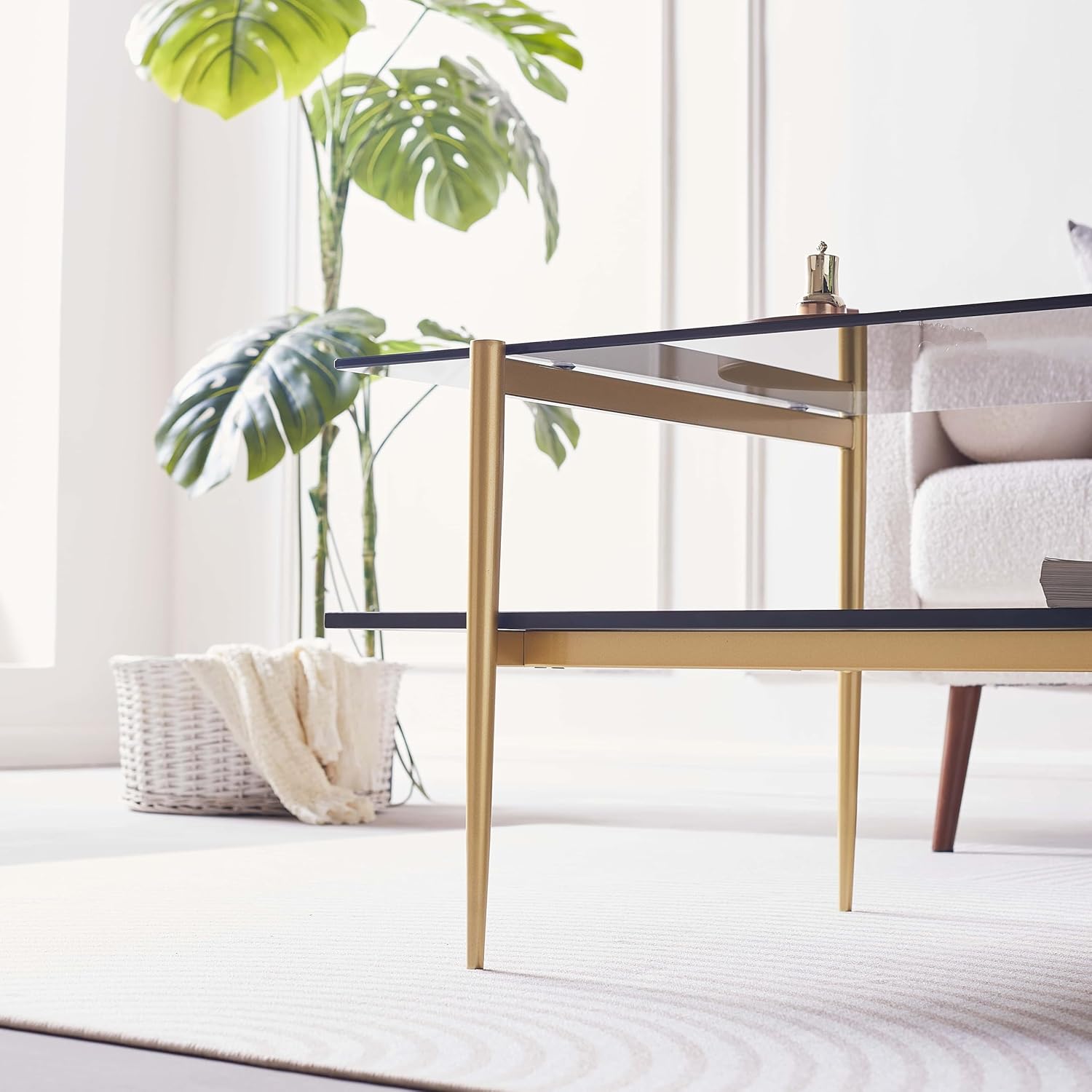 Rectangle Coffee Table for Living Room, Mid-Century Modern Design, L41 x W21 x H17, 2-Tier Structure, Clear Glass Top and Black Marble Wood Shelf, Conical Metal Legs with Gold Finish