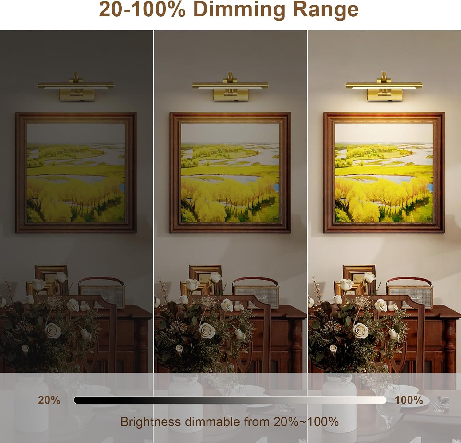 - Dimmable&Timer Function: Wireless picture light comes with a remote to activate dimmable and timer function. The brass picture light can be dimmable, and auto-off in 0.5-4 hours with convenient remote control.
