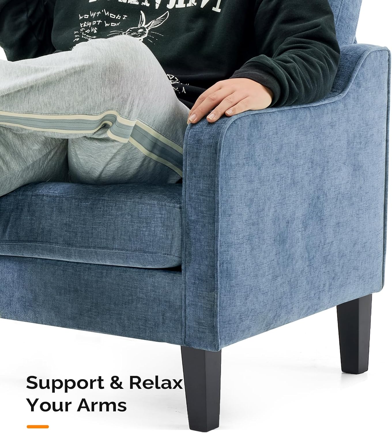 - Stability and DurabilityâThis living room chair is made with fluffy chenille fabric, resilient foam cushions with steel springs, a sturdy metal backrest, and solid wood legs. With a weight limit of 380 lbs, it ensures exceptional stability and comfort