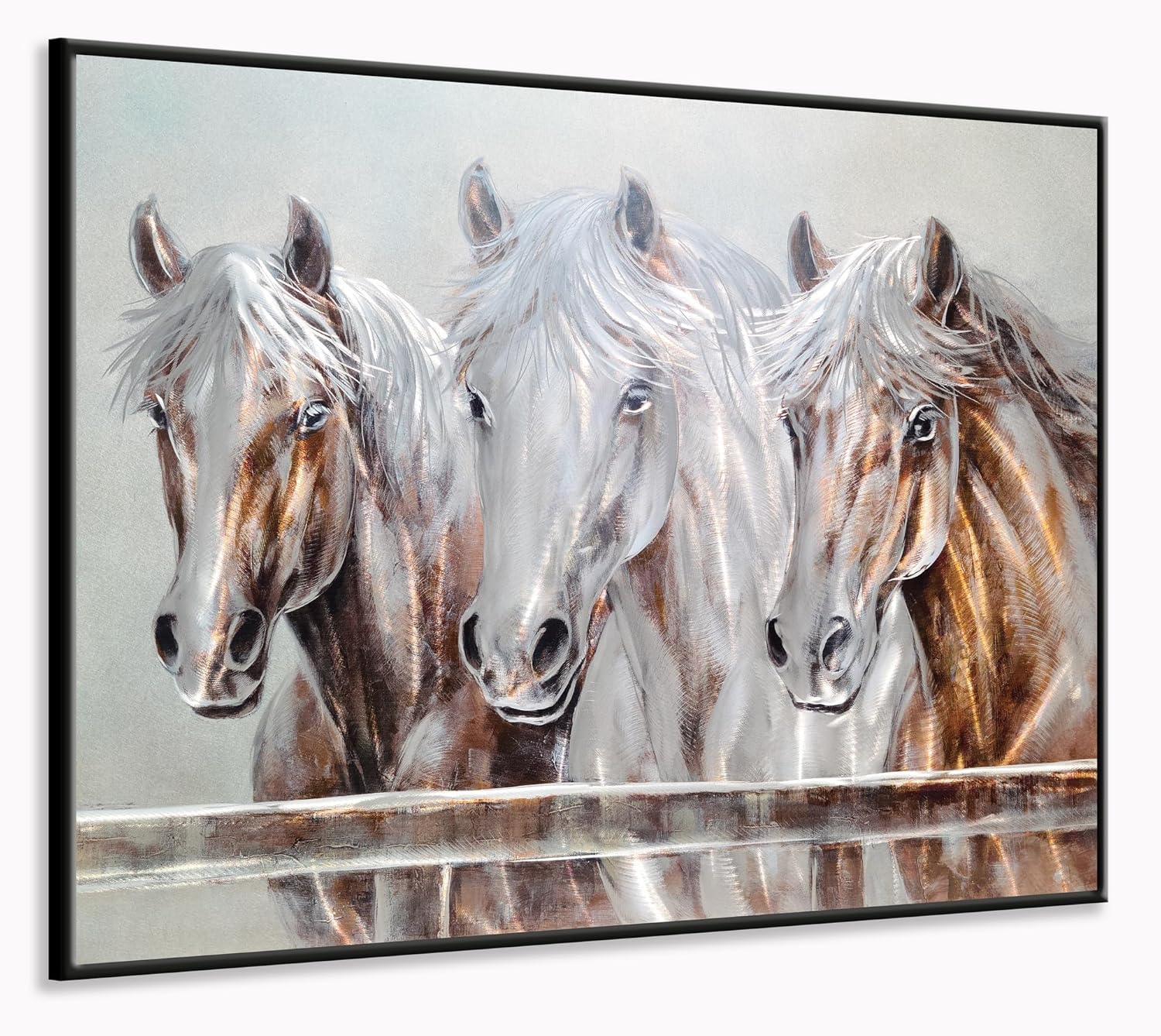 - Enhance your living space with the Yihui Arts Rustic Metal Wall Art, featuring a hand crafted 3D aluminum artwork of three horse heads in brown, silver, and beige tones.