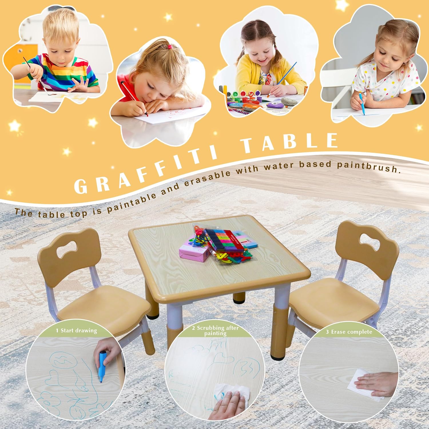 - ăErasable DesktopăThe surface of the toddler table is coated with polyurethane, enhancing its water resistance and durability against cracks. Watercolor and colored pencil marks can be wiped off the table with just a damp cloth! Enabling children to freely express their artistic abilities. IMPORTANT: It is advised to use a damp cloth for cleaning purposes.
