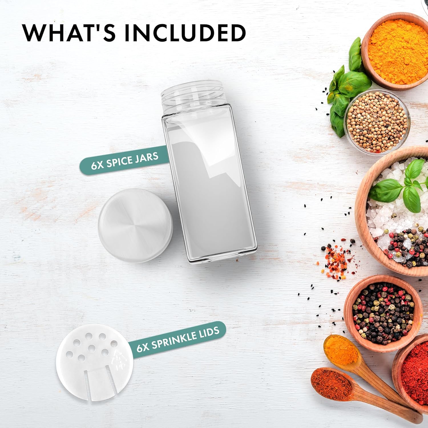 - HIGH-GRADE STAINLESS STEEL: The set includes 6 square spice jars with round stainless steel lids, a stainless steel funnel, 6spice shakers/dispensers.