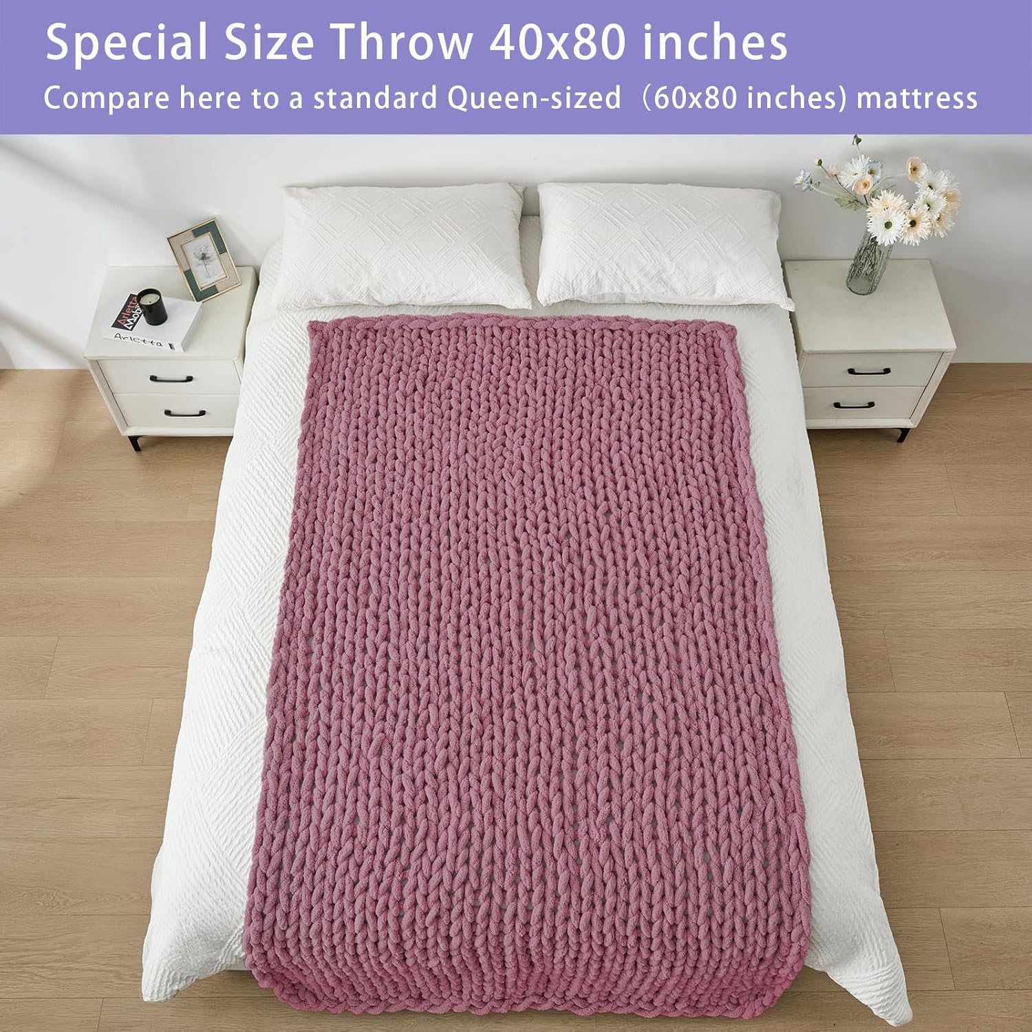 Bigacogo Chunky Knit Throw Blanket for Couch, 40x80 inches, 100% Hand Knitted with Thick Jumbo Chenille Yarn, Cozy Soft Large Rope Knot Cable Crochet Blankets for Sofa Bed Living Room, Burnt Rose