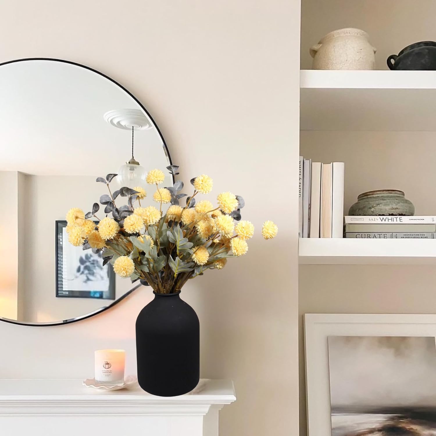 - Vibrant Mustard Yellow Floral Arrangement β This set features 10 long stem yellow kiku flowers with 50 yellow flower balls, and 2 eucalyptus branches, offering a rich texture and natural aesthetic. The mustard yellow flowers blend beautifully into spring floral arrangements, Easter flowers artificial for decoration, boho bouquets, and fall floral decor, making them perfect for wildflower decor, table centerpieces, and home accents.