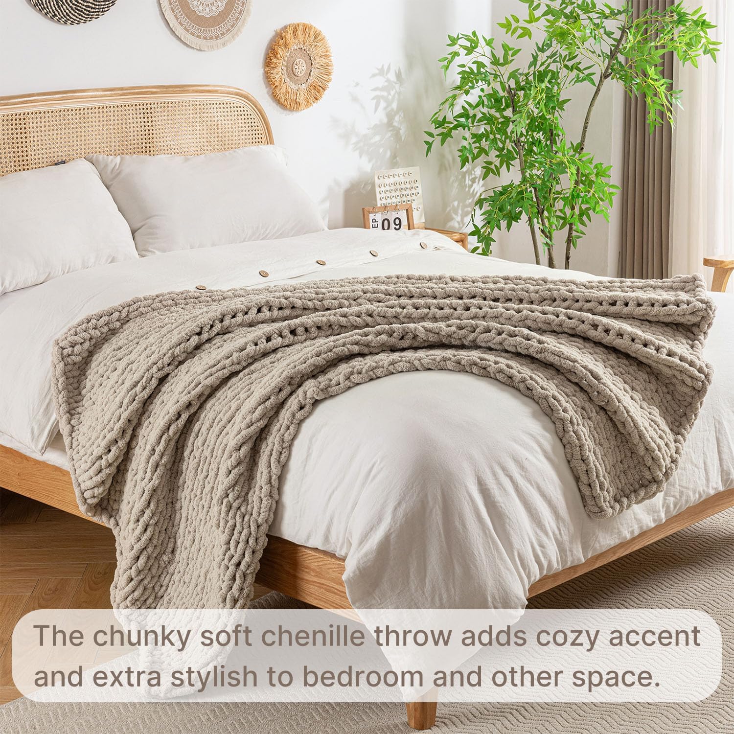Chunky Knit Blanket Throw, 100% Hand Knit Throw Blanket Handmade Chenille Cable Knit Throw for Couch, Stylish Cozy Soft Rope Knot Crochet Blanket for Home Decor, Beige Linen, 60x80 Inches