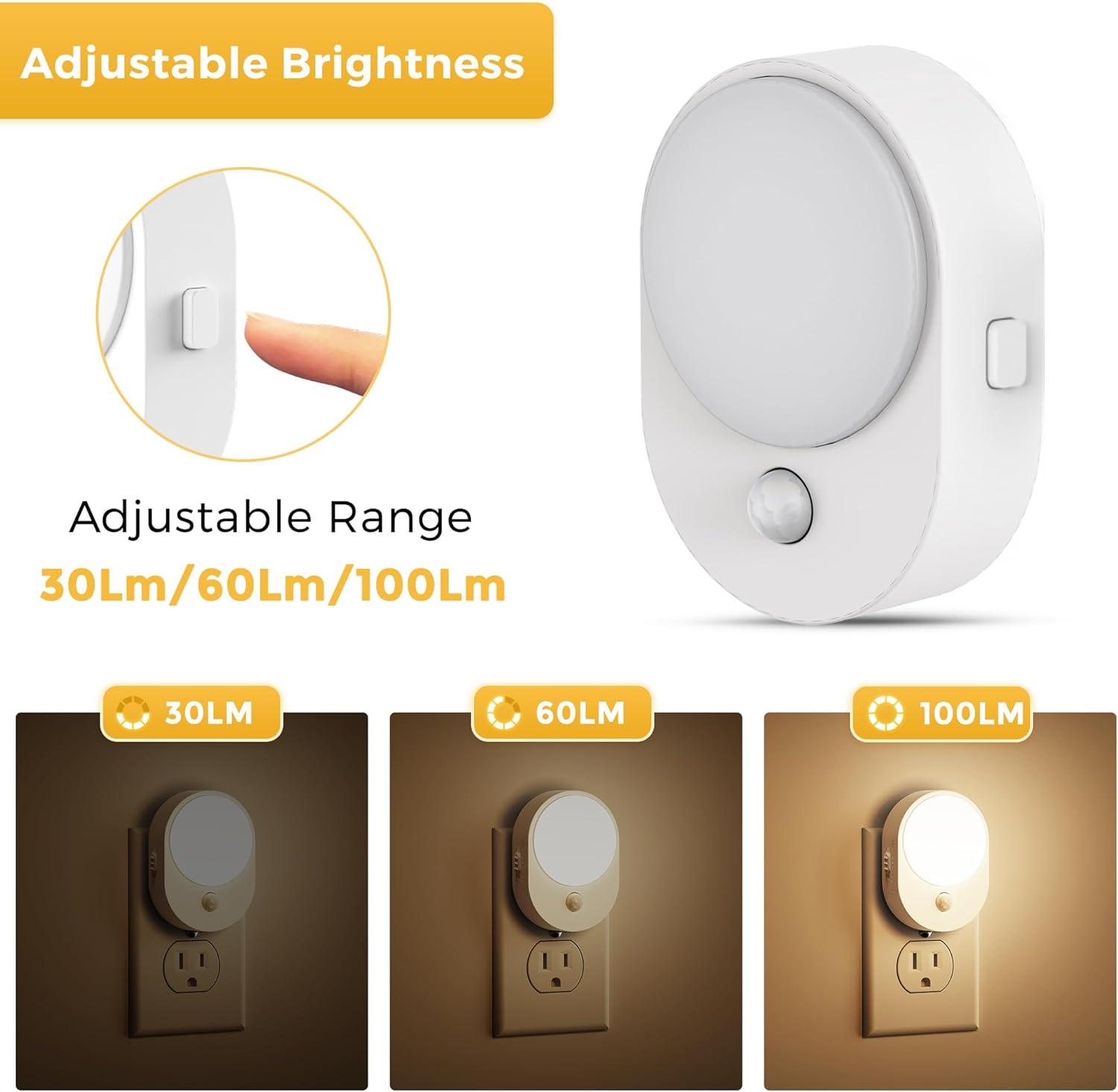 - Adjustable Brightness: The motion sensor night light comes with 3 different levels(30LM/60LM/100LM) of brightness control settings.