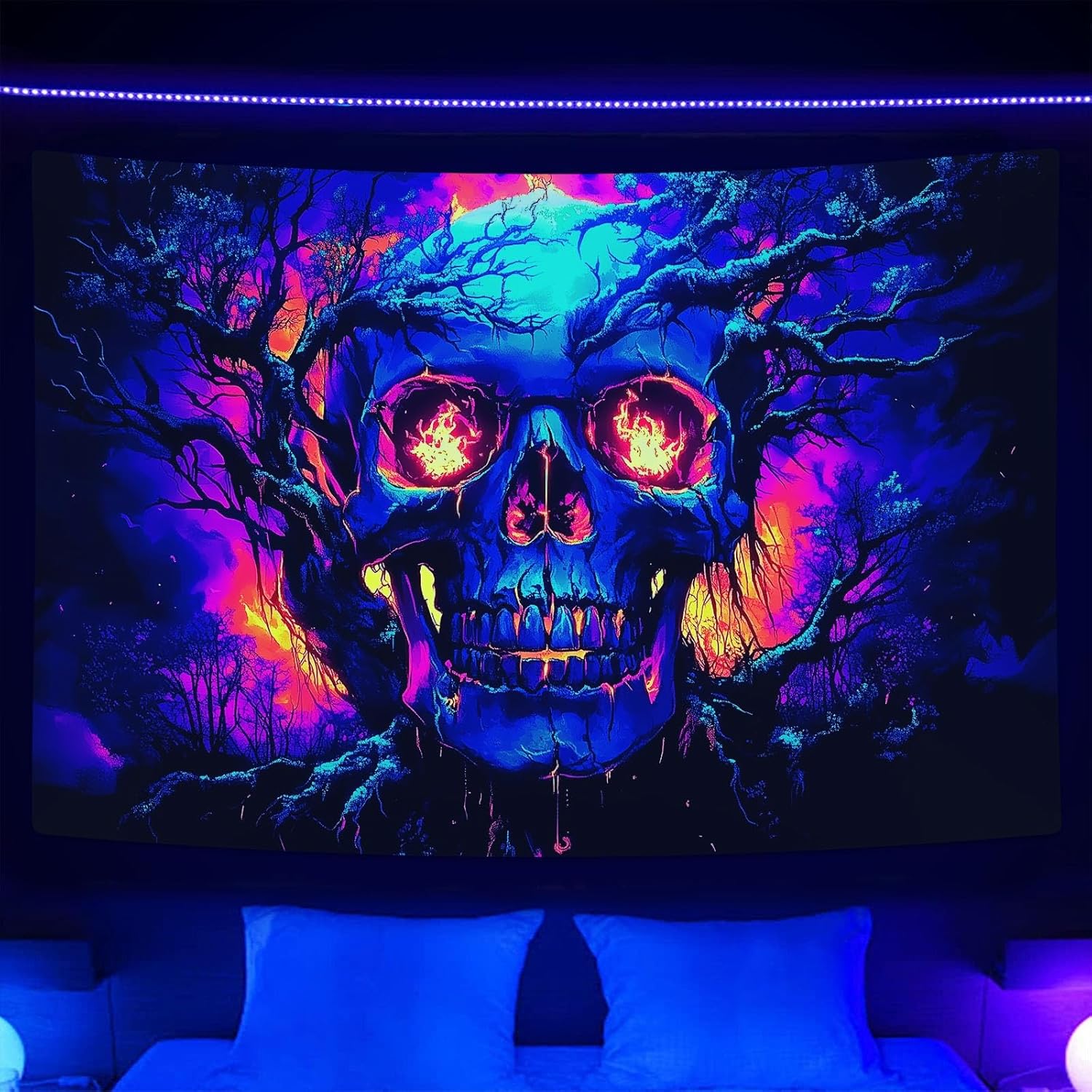 Xiaoput Blacklight Fire Skull Tapestry for Bedroom, Trippy UV Reactive Burning Skeleton Forest Wall Hanging Tapestries, Scary Dark Horror Glow in the Dark Tapestries for Living Room Home Dorm 60X40IN