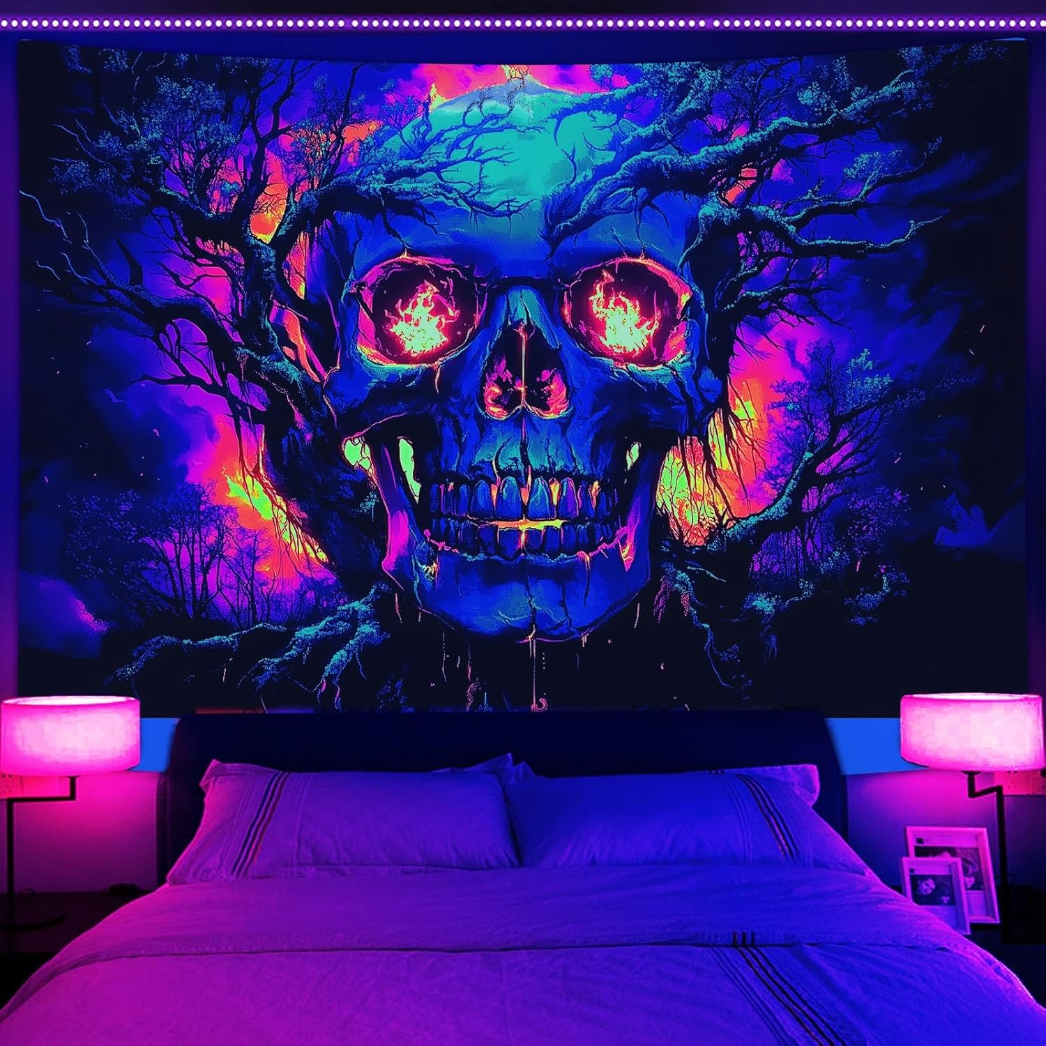 - Unique Pattern Design:The blacklight skull tapestry features a mysterious skull, charming mushrooms, and psychedelic flowers and plants. Under black/ultraviolet light, it can fill your room with mysterious and psychedelic colors.