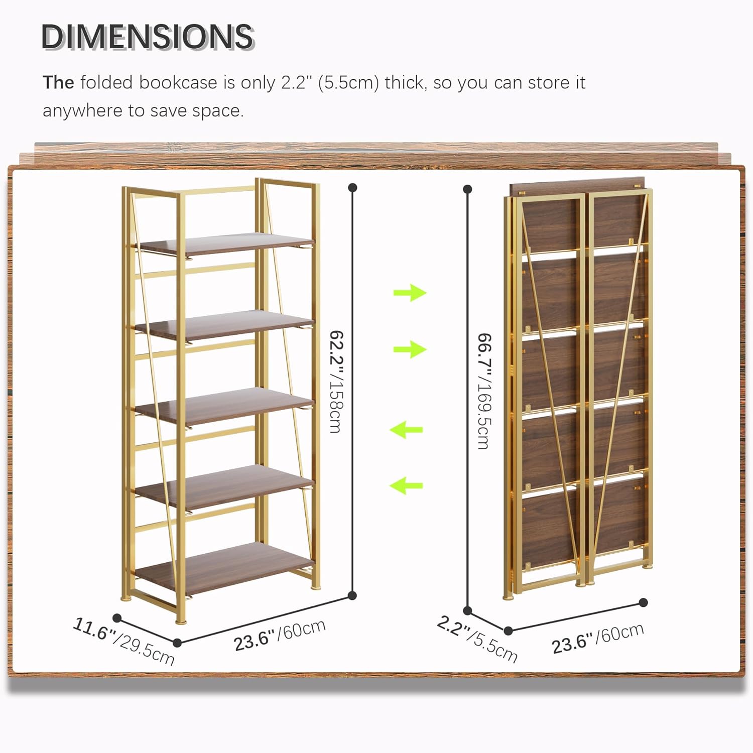 4NM No Assembly Foldable Bookshelf, 5-Shelf Collapsible Bookcase Storage for Small Spaces, 62.2" H, Brown and Golden
