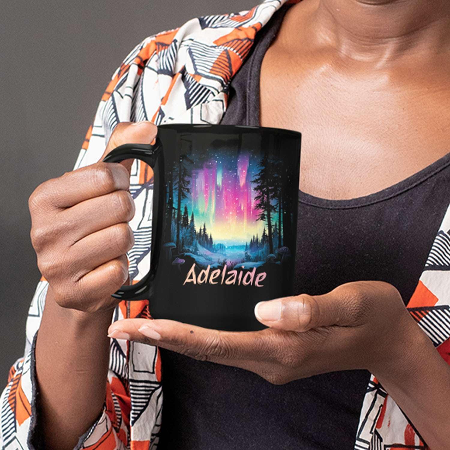 Personalized Winter Landscape Coffee Mug, Custom Northern Lights Ceramic Cup, Enchanted Forest With Vibrant Sky Mug, Custom Choose Name Black Mug 11oz 15oz, Gift For Nature Lovers