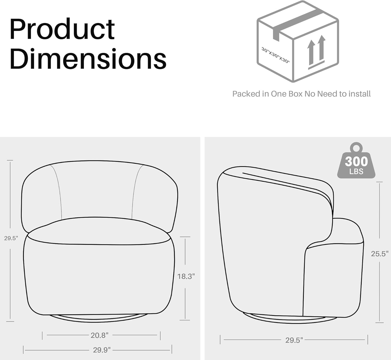 - WORRY FREE PURCHASE: Overall size: 29.5" D X 29.9" W X 29.8" H. Gross Weight: 62.7 lbs. With a seat size of 20.8," W X 21.6" D. The swivel chair does not need to be assembled, it's convenient