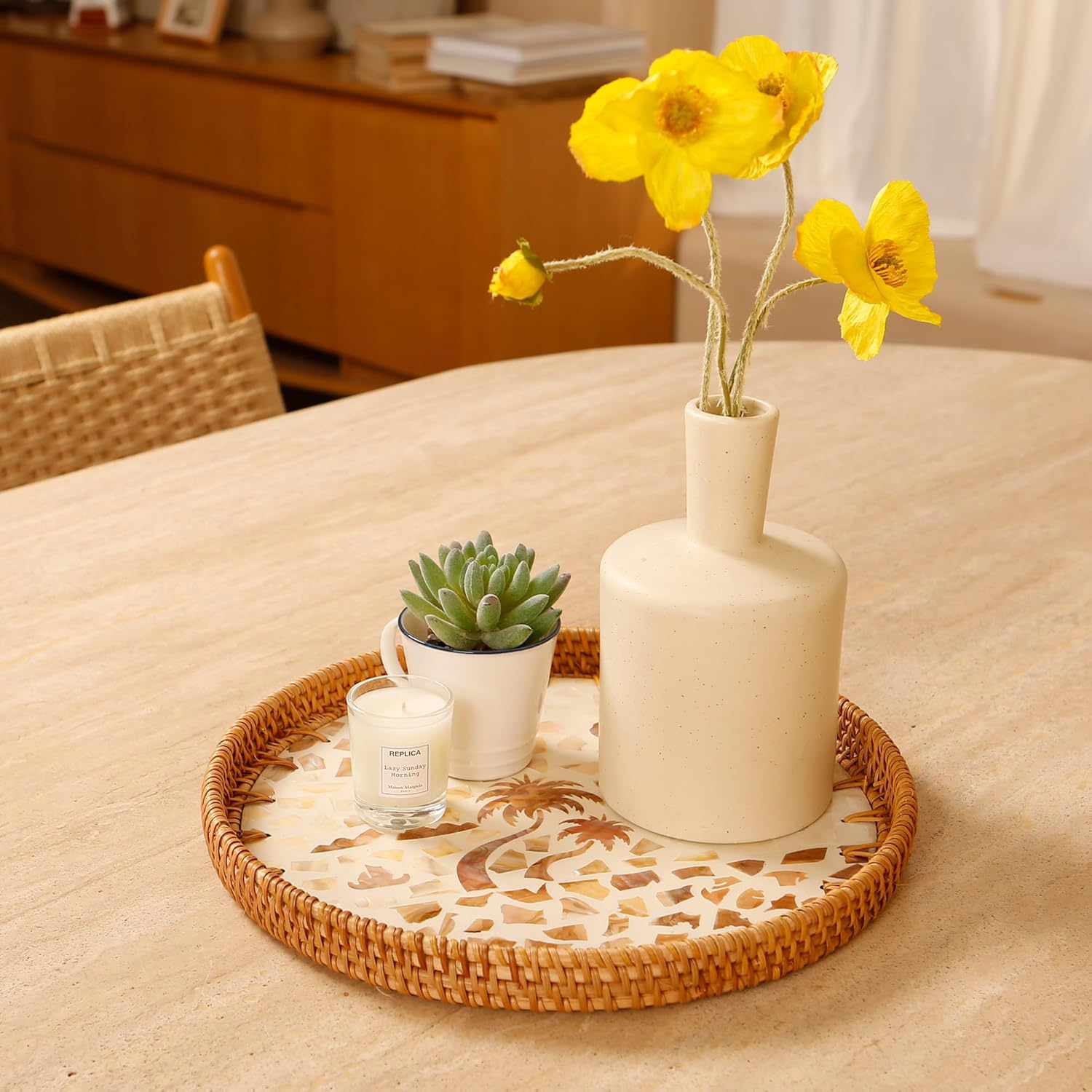 Round Rattan Tray with Mother of Pearl Inlay & Wooden Base - Decorative Wicker Serving Tray for Coffee/Bread/Fruits, Food Storage & Display - Multipurpose Home Decor (L,Island)