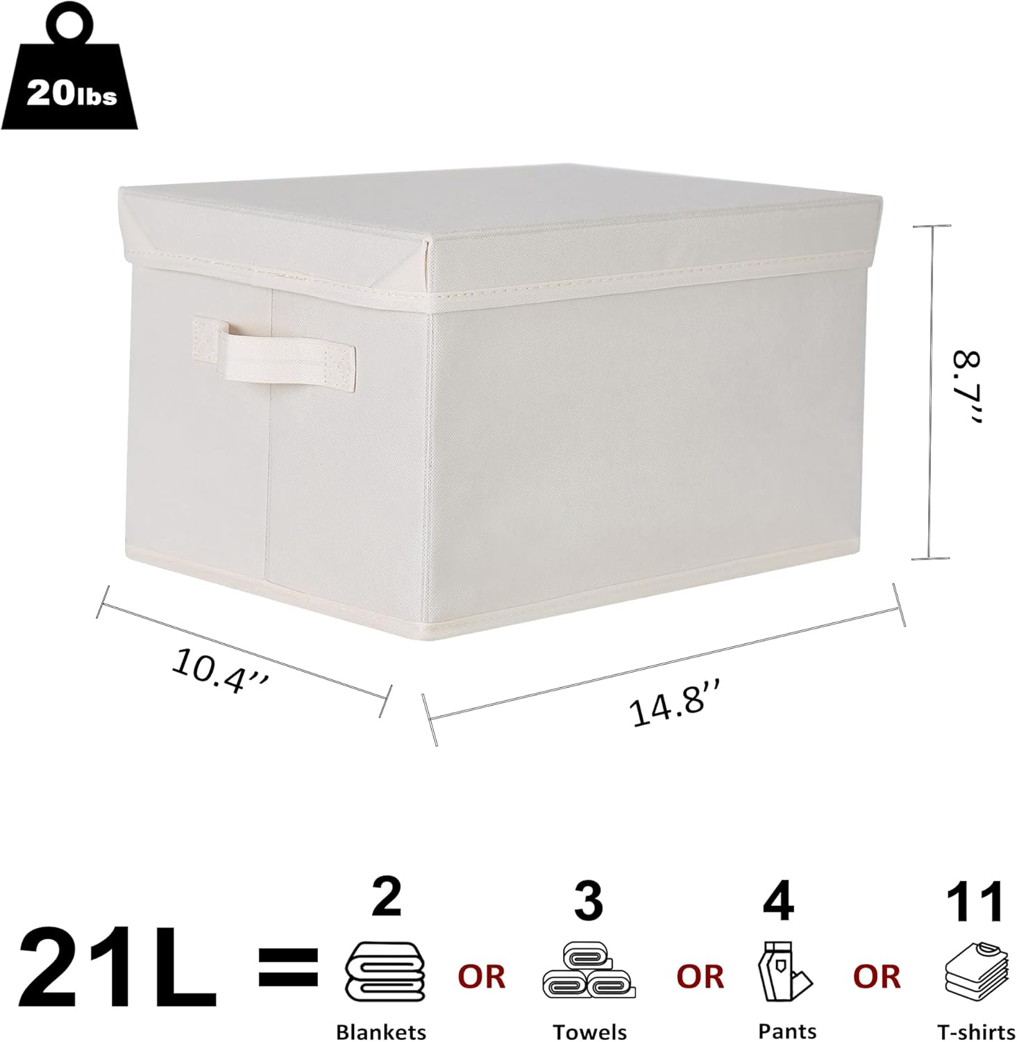 - Large Size & Versatile Storage: Each storage box with lid measures 14.8"L x 10.4"W x 8.7"H, with a capacity of 21 liters and weighs 1.53 lbs. Suitable for storing clothes, pants, socks, bed sheets, towels, blankets, books, and more. Fits in most closets, shelves, or under the bed.