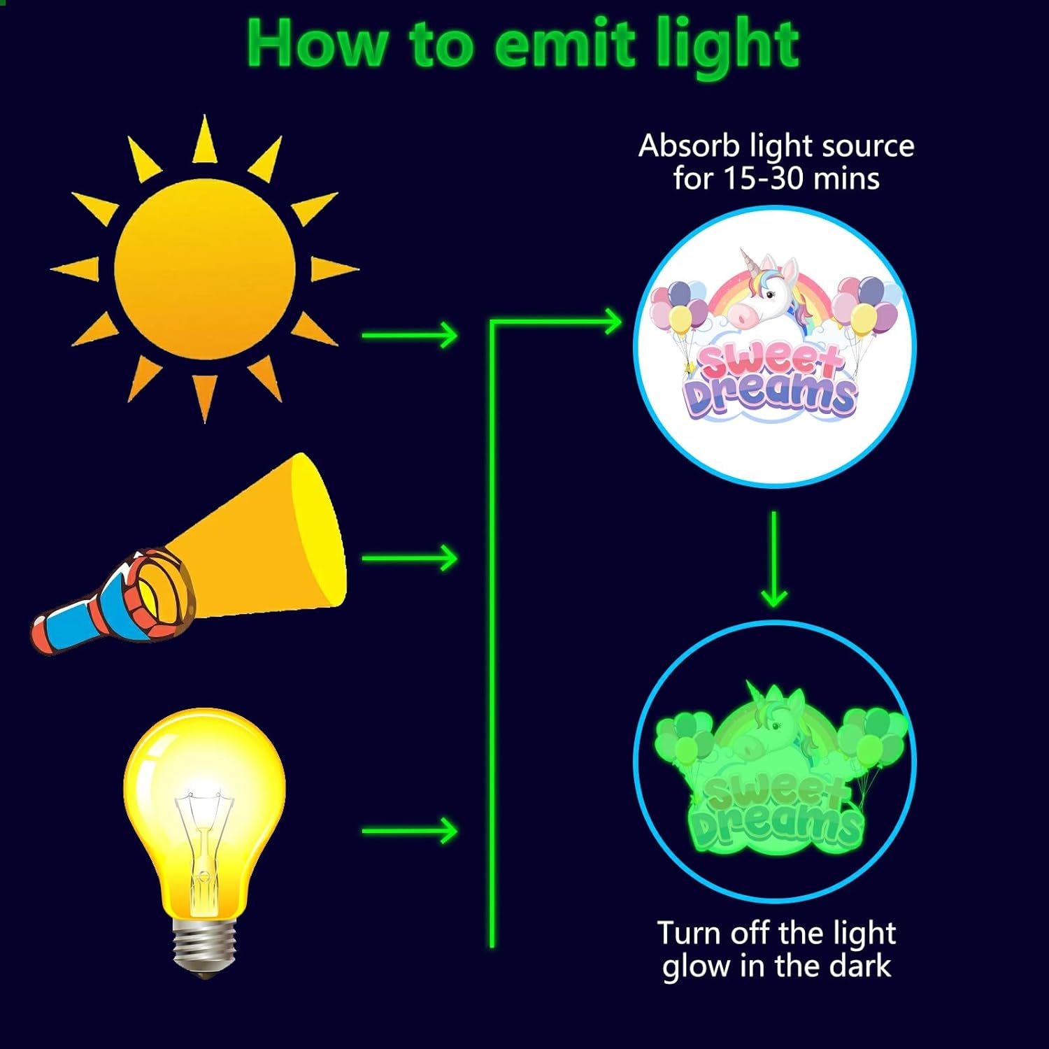 - ✦ Glow Unicorn Wall Decals: These glow wall decals for ceiling are made of quality luminous material,they will glow brightly when absorb enough light during the day. You just need to put it under lamplight flashlight ,room light or sunshine for 15 minutes, it will keep glowing for 8-10 hours with a gentle green fluorescent light. Please ensure the light shines on the decals without obstruction, the longer it takes to absorb light, then to light up for up to longer.