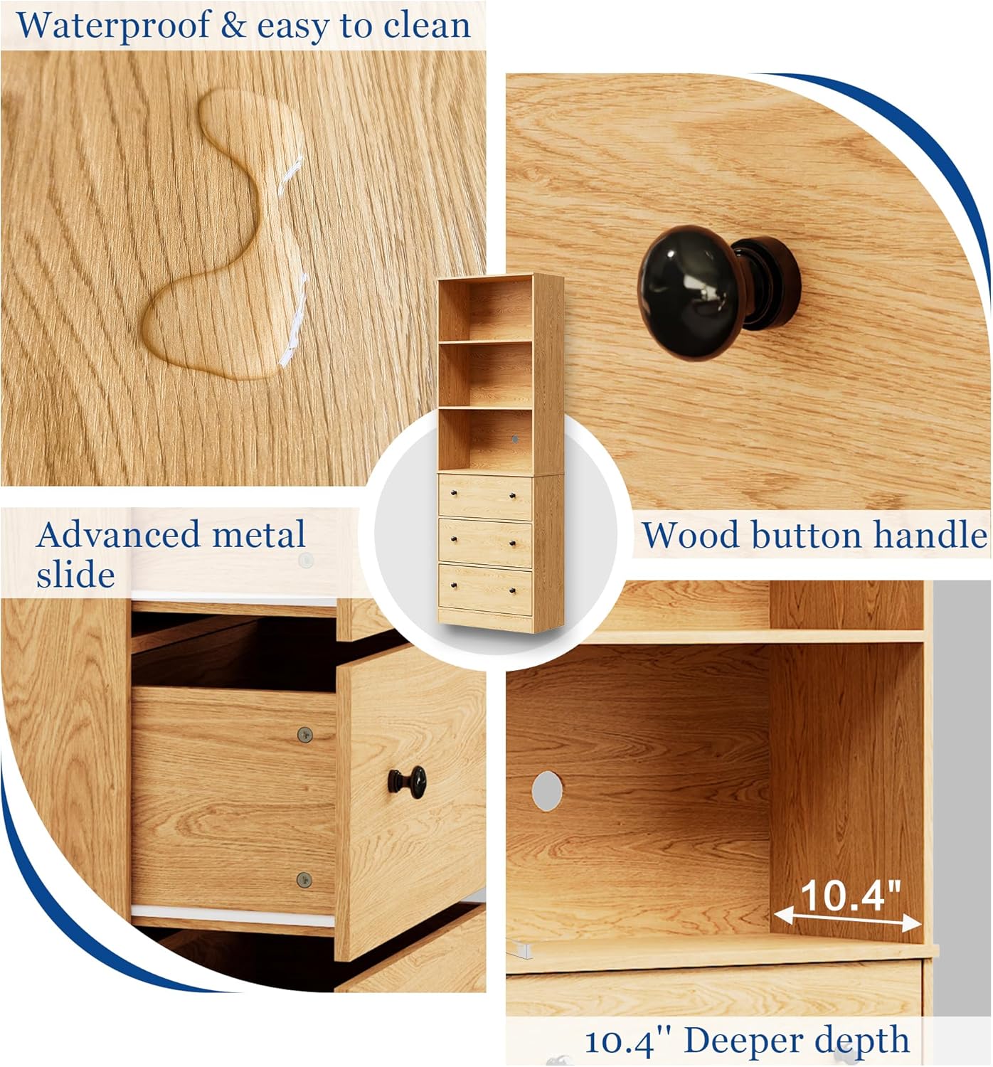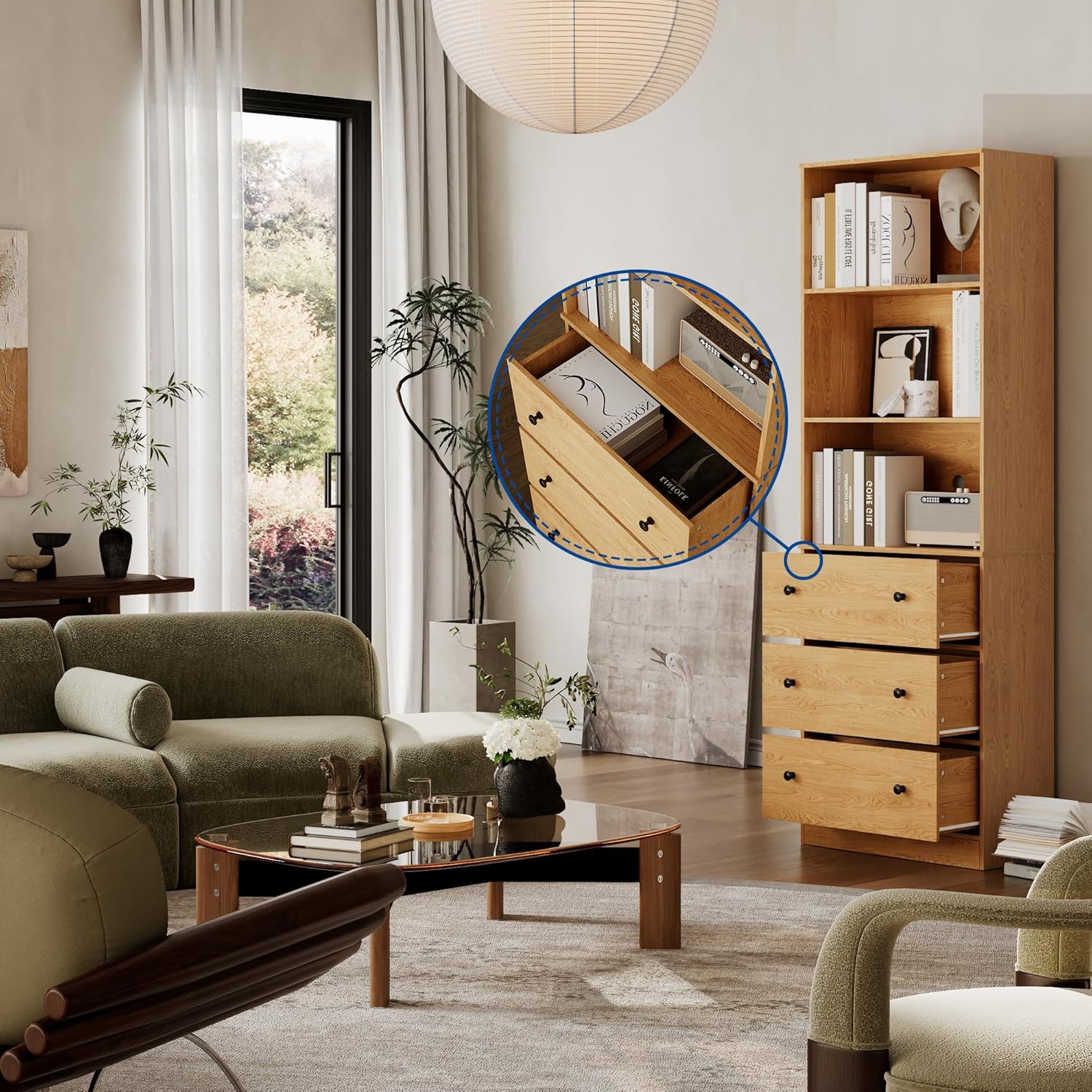 - ă71" Tall Bookcase with 3 Shelves & 3 Drawersă- This book storage shelf stands at 71" tall, providing ample vertical storage with 3 open shelves and 3 built-in drawers. Made from high-quality, waterproof, and scratch-resistant particleboard. The additional anti-tipping iron plate reinforces the tall cabinetâs stability, giving you peace of mind and preventing accidental tipping, especially in homes with children or pets.