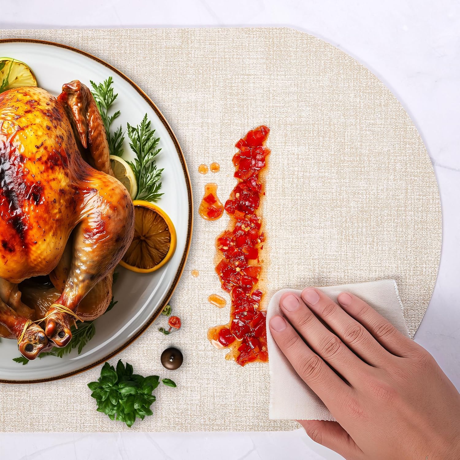 DOLOPL Placemats Set of 6, Oval Large Beige Place Mats for Kitchen Dining Room Table Decorations, Faux Leather Anti Slip Waterproof Dining Table Place Mats for Indoor & Outdoor Use(13.8"x21.6")