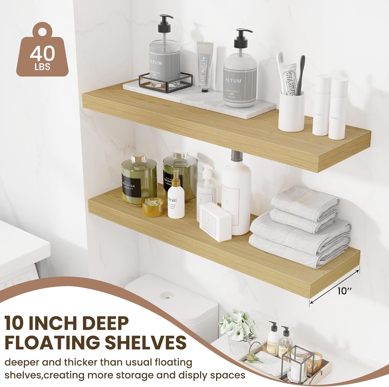 Fun Memories Floating Shelves for Wall 36 Inches, Wood Shelves with Invisible Bracket, 10" Deep Shelves Wall Mounted, Large Wood Floating Shelves for Living Room Bathroom, Oak, Set of 2