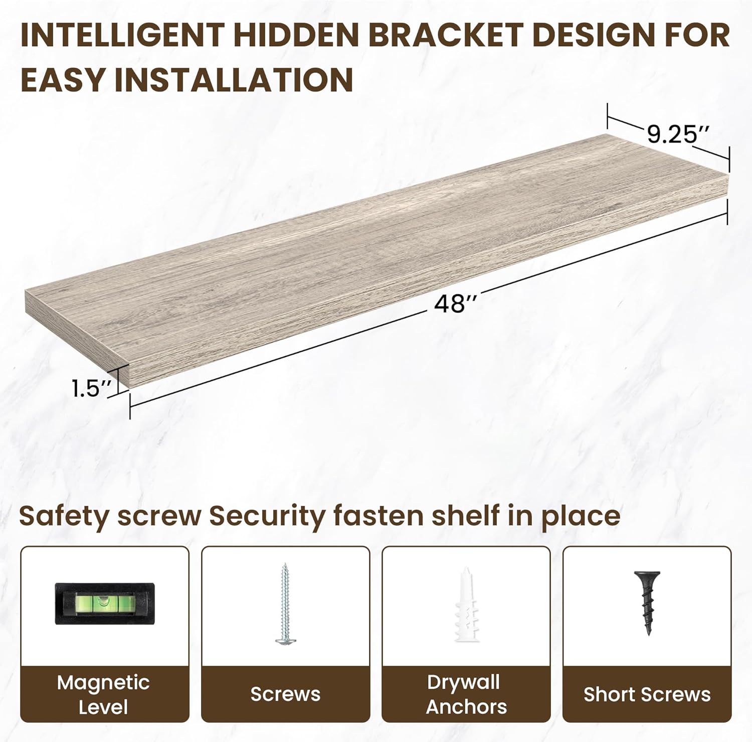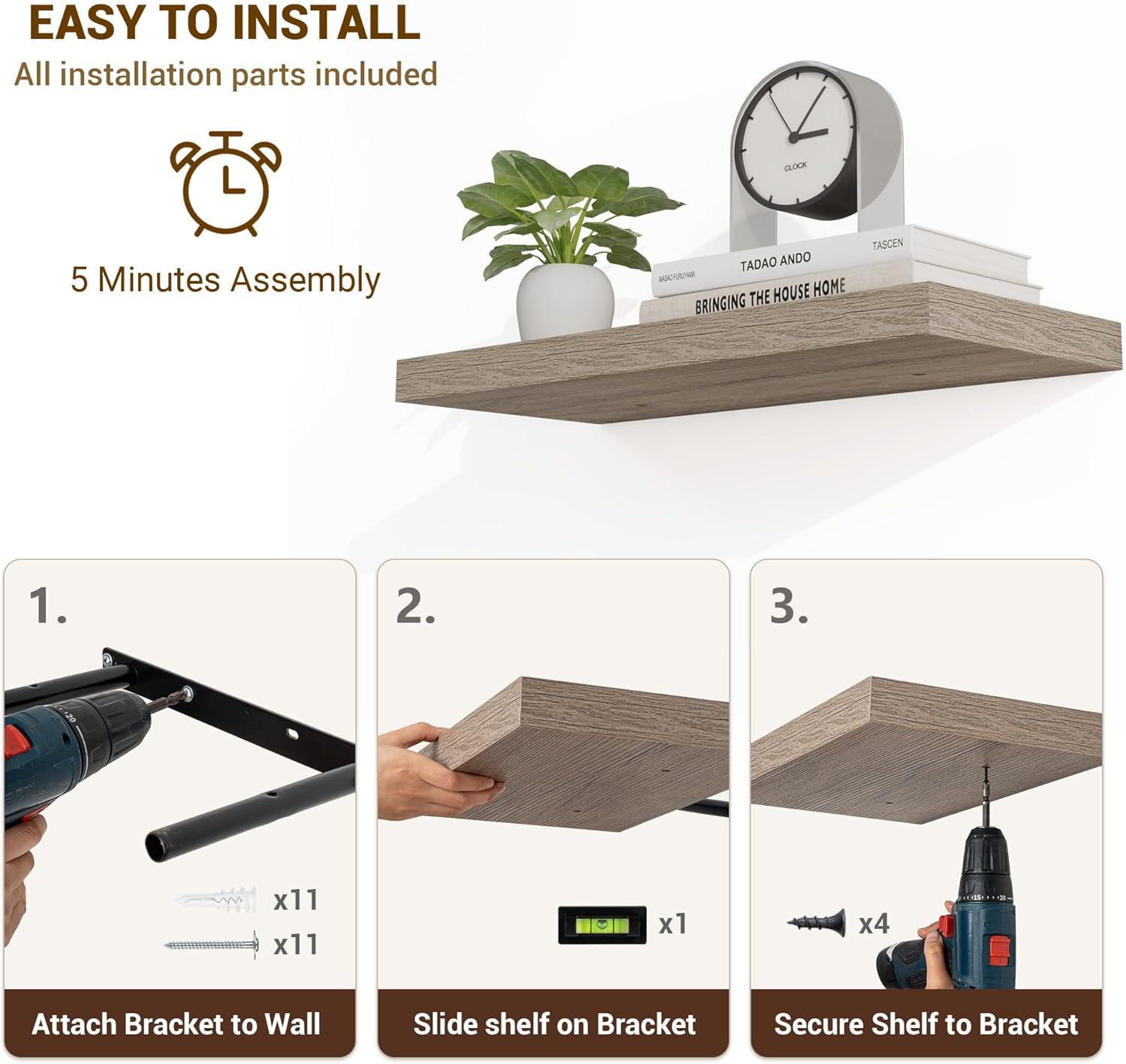 - ăEasy InstallationăDesigned with user convenience in mind, these shelves come with all necessary mounting hardware and clear instructions. You can have them up and ready to use in less than 5 minutes. Plus, our customer service is always ready to assist with any queries or concerns, ensuring a hassle-free experience