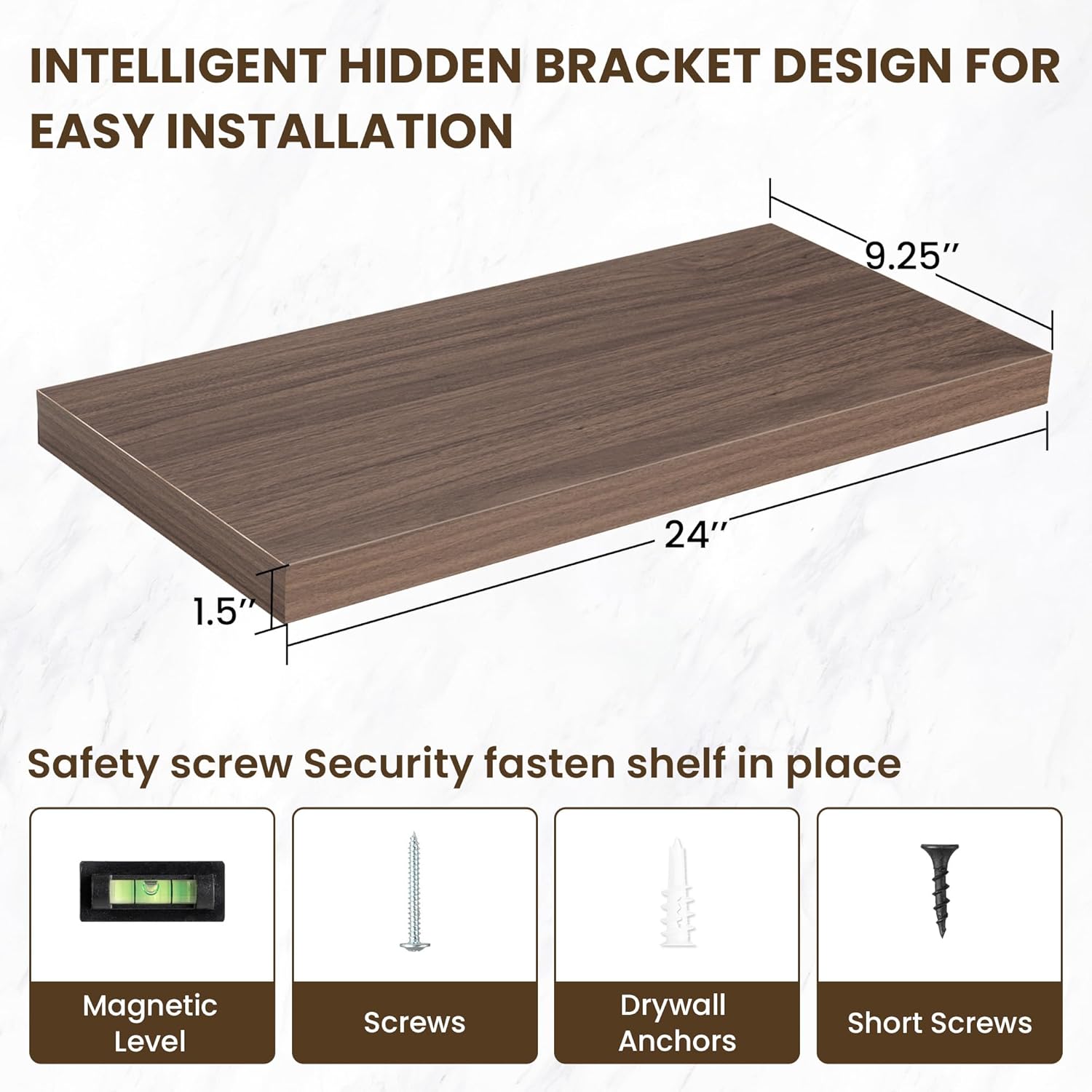 24 Inch Floating Shelves, 24"x9.25"x1.5" Inch Deep Floating Shelves for Wall, Wooden Shelves for Bathroom, Bedroom, Living Room, Walnut
