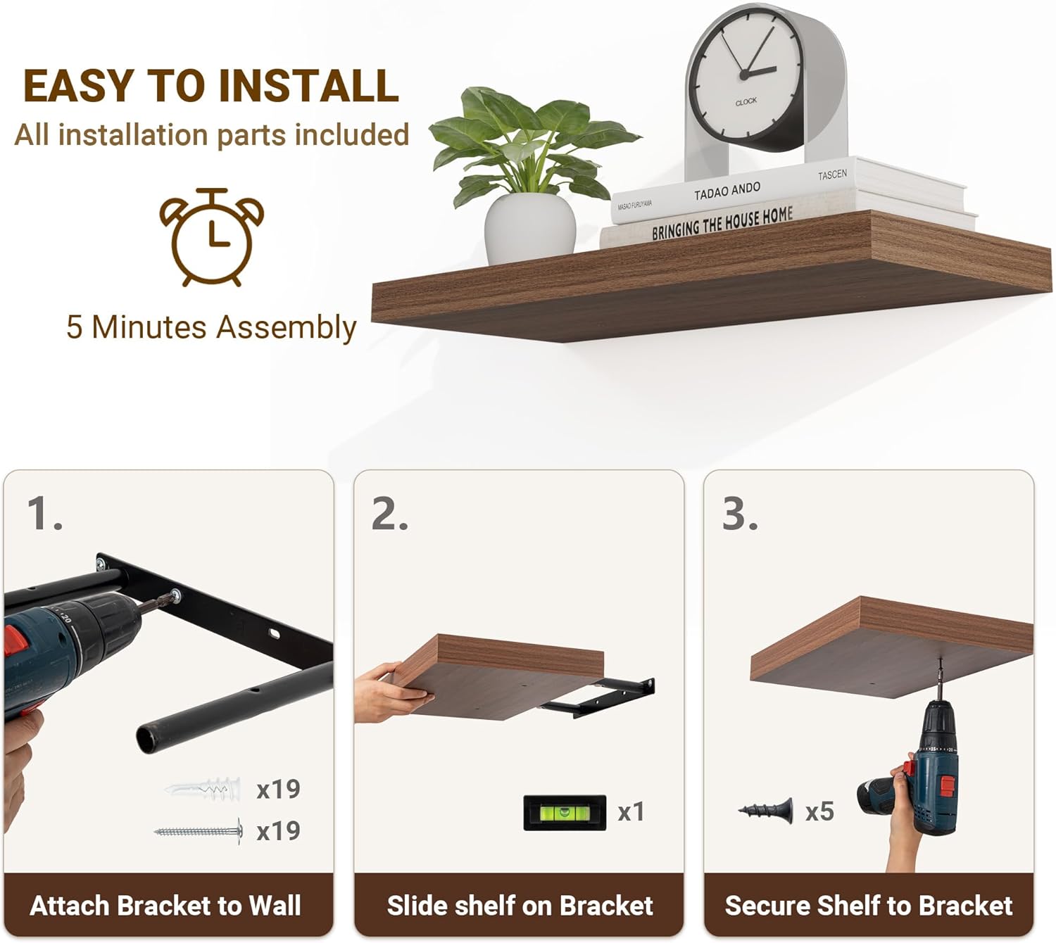 - ăEasy InstallationăDesigned with user convenience in mind, these shelves come with all necessary mounting hardware and clear instructions. You can have them up and ready to use in less than 5 minutes. Plus, our customer service is always ready to assist with any queries or concerns, ensuring a hassle-free experience