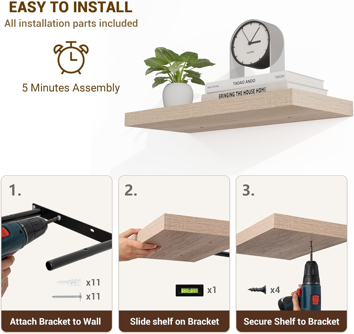- ăEasy InstallationăDesigned with user convenience in mind, these shelves come with all necessary mounting hardware and clear instructions. You can have them up and ready to use in less than 5 minutes. Plus, our customer service is always ready to assist with any queries or concerns, ensuring a hassle-free experience