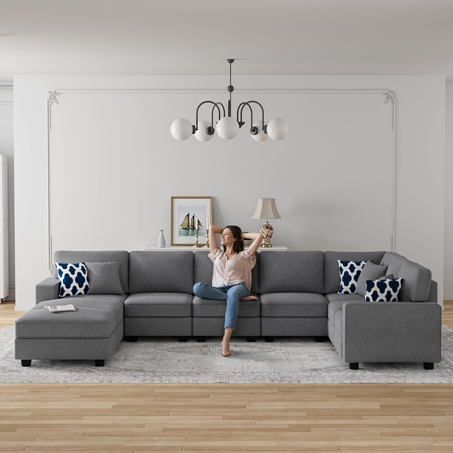- ăErgonomic DesignăThe backrest of the couches for living room perfectly fits the human body curve, the armrests are wide and at the right height, and the living room sofa as a whole is ergonomically designed to give you comfortable support. The modular sectional sofa is paired with multiple multi-functional small pillows, allowing you to relax anytime, anywhere. The oversized couch has a weight capacity of up to 660 pounds to give you stable support.