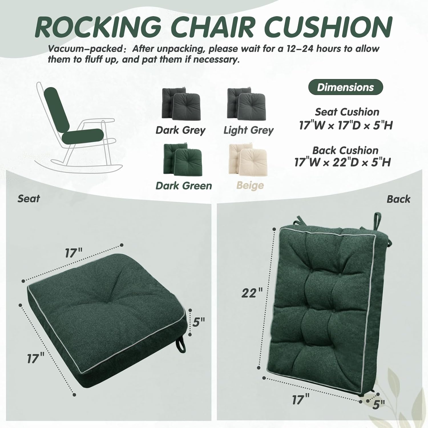 YZ HOME Rocking Chair Cushion, Set of Thicken Seat & Back Chair Cushions with Memory Foam, Non-Slip Chair Pad with Ties for for Indoor&Outdoor Rocker, Dark Green, 22x17x5/17x17x5