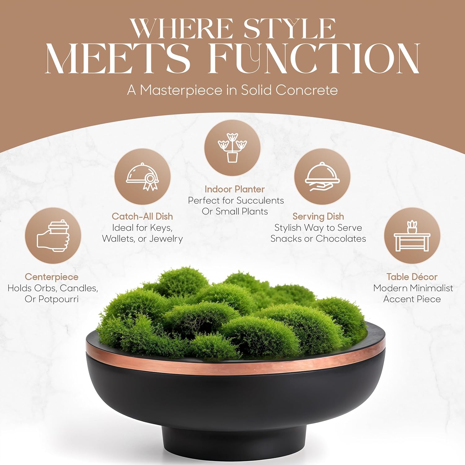 - 【CONCRETE FRUIT BOWL】 This concrete fruit bowl, designed as a stylish pedestal bowl with a matte black finish and rose gold rim, doubles as a decorative centerpiece and functional display. Ideal for use as a concrete bowl, black decorative bowl, or modern fruit holder. Elevate your kitchen counter, coffee table, or dining space with a bold, artisan-crafted statement piece.