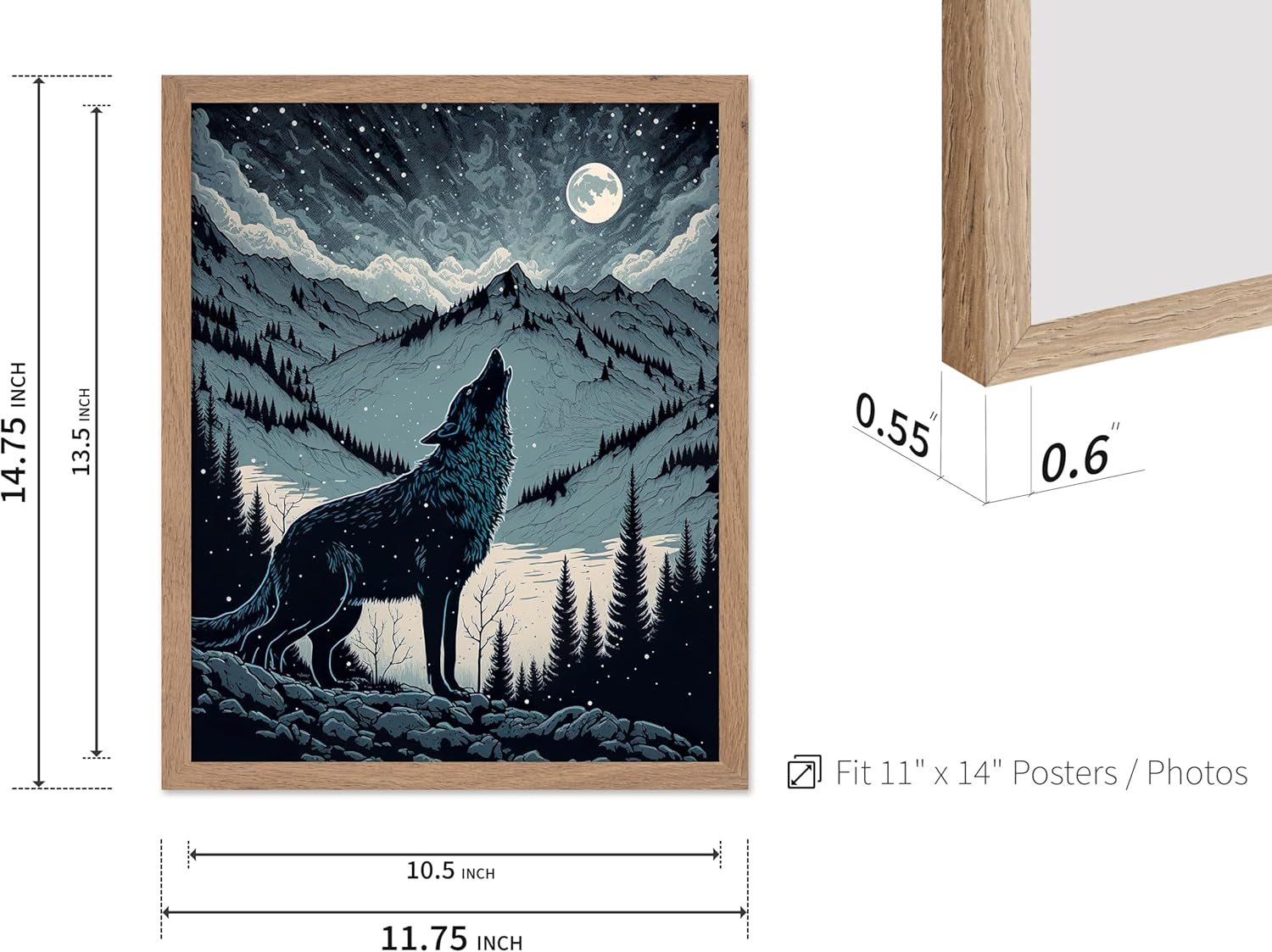 Poster Master Vintage Illustration Poster - Retro Animal Print - Gift for Artist, Friend - Wolf Howling at the Moon, Mountain, Snow, Landscape - Wall Decor for Home, Office, 11x14 Beige Framed