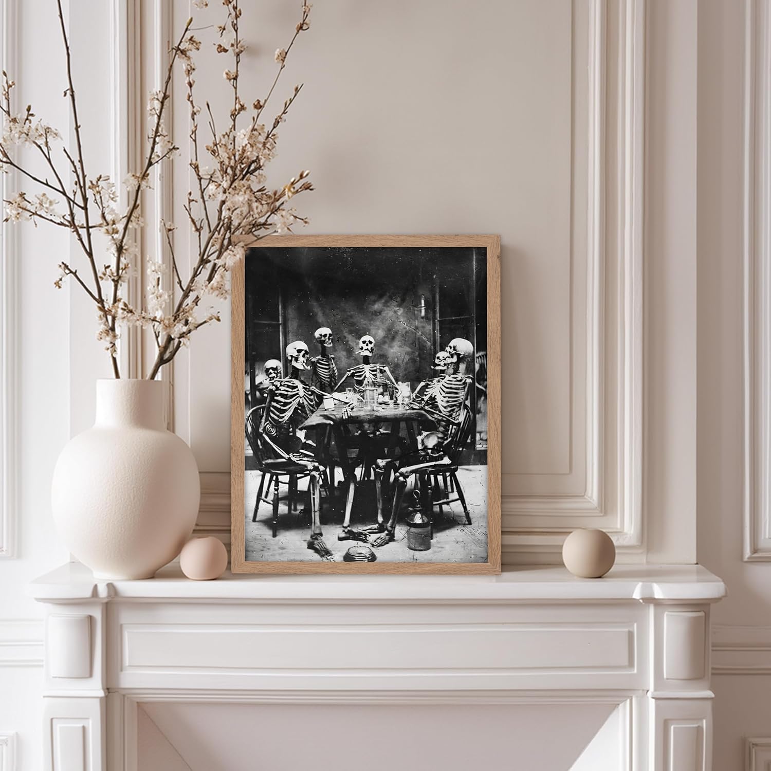 Poster Master Vintage Photograph Poster - Retro Daguerreotype Print - Gift for Artist, Friend - Skeletons Smoking at Table, Dinner Party, Goth - Wall Decor for Home, Dorm, 11x14 Beige Framed