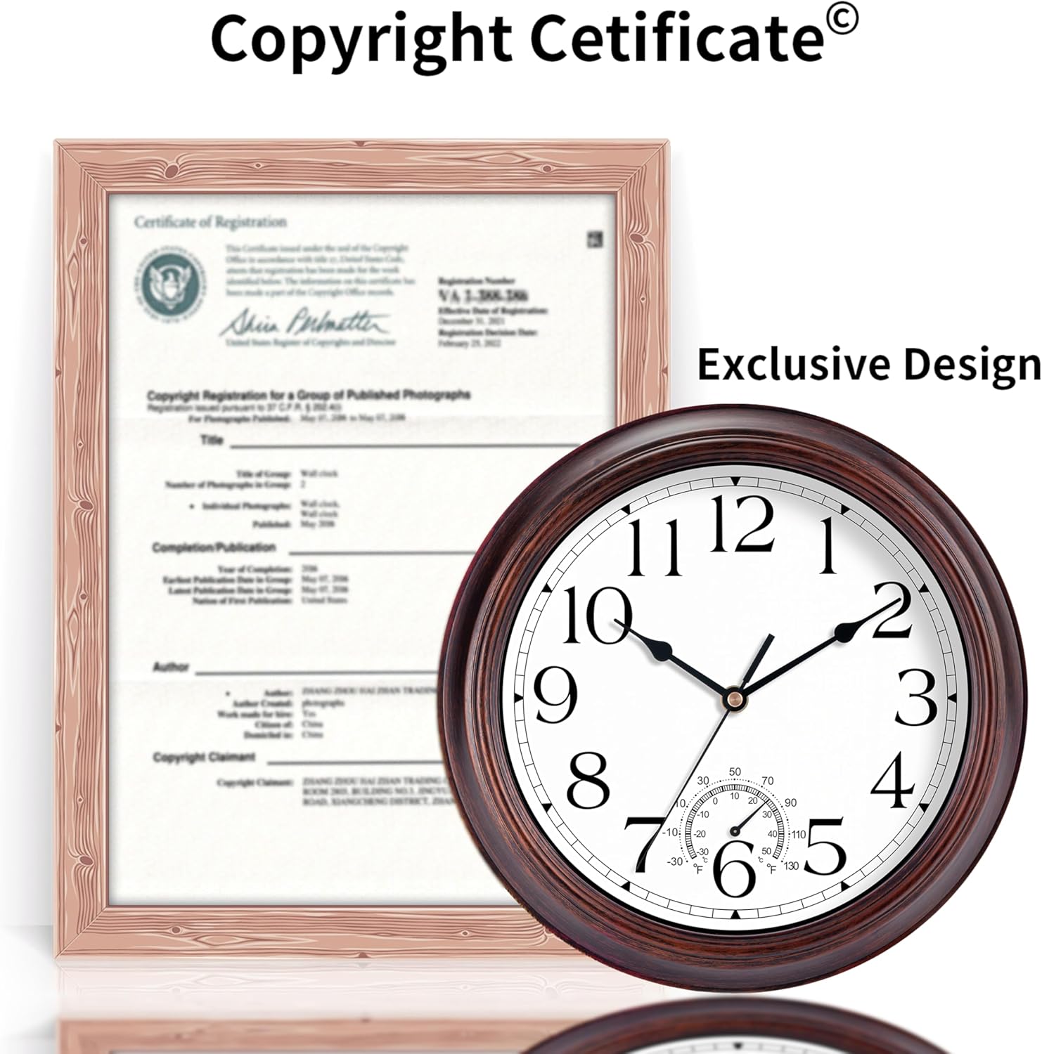 10 Inch Outdoor Wall Clock with Thermometers, Vintage Silent Wall Clocks Battery Operated, Retro Non-Ticking Clock Decorative for Living Room, Patio, Kitchen, Office, Bathroom, Bedroom(Bronze)