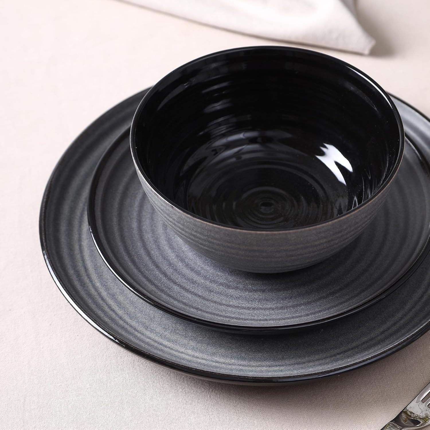 Stone Lain Dua 24-Piece Dinnerware - Stoneware, Plate and Bowls, Dishwasher and Microwave Safe, Dish Set for 8, Black