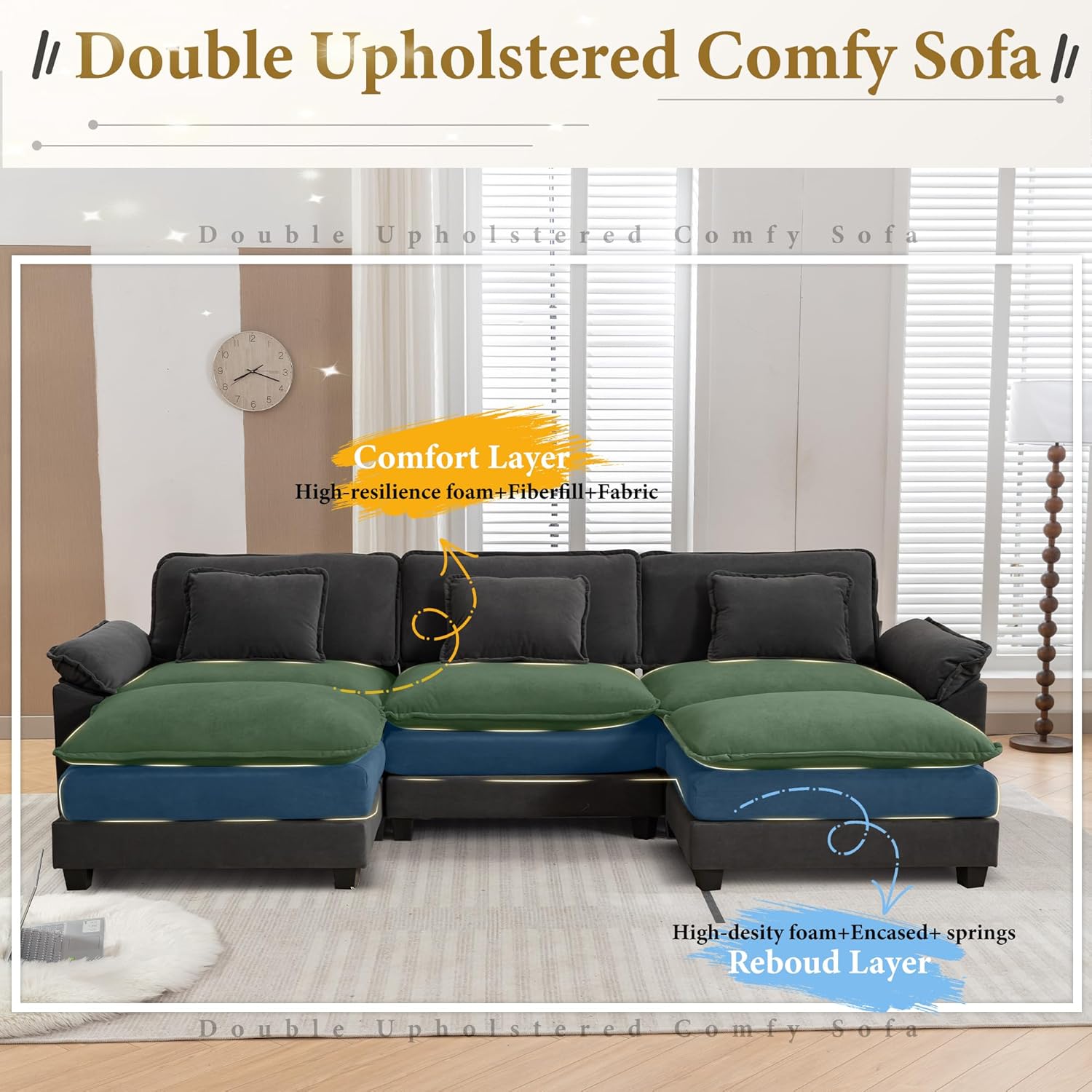 - Double Upholstered Sofa:The living room creative sofa is double thickly upholstered with high-density sponge padding and spring system, bringing luxurious comfort and support, greatly avoiding collapsing during long-term use.