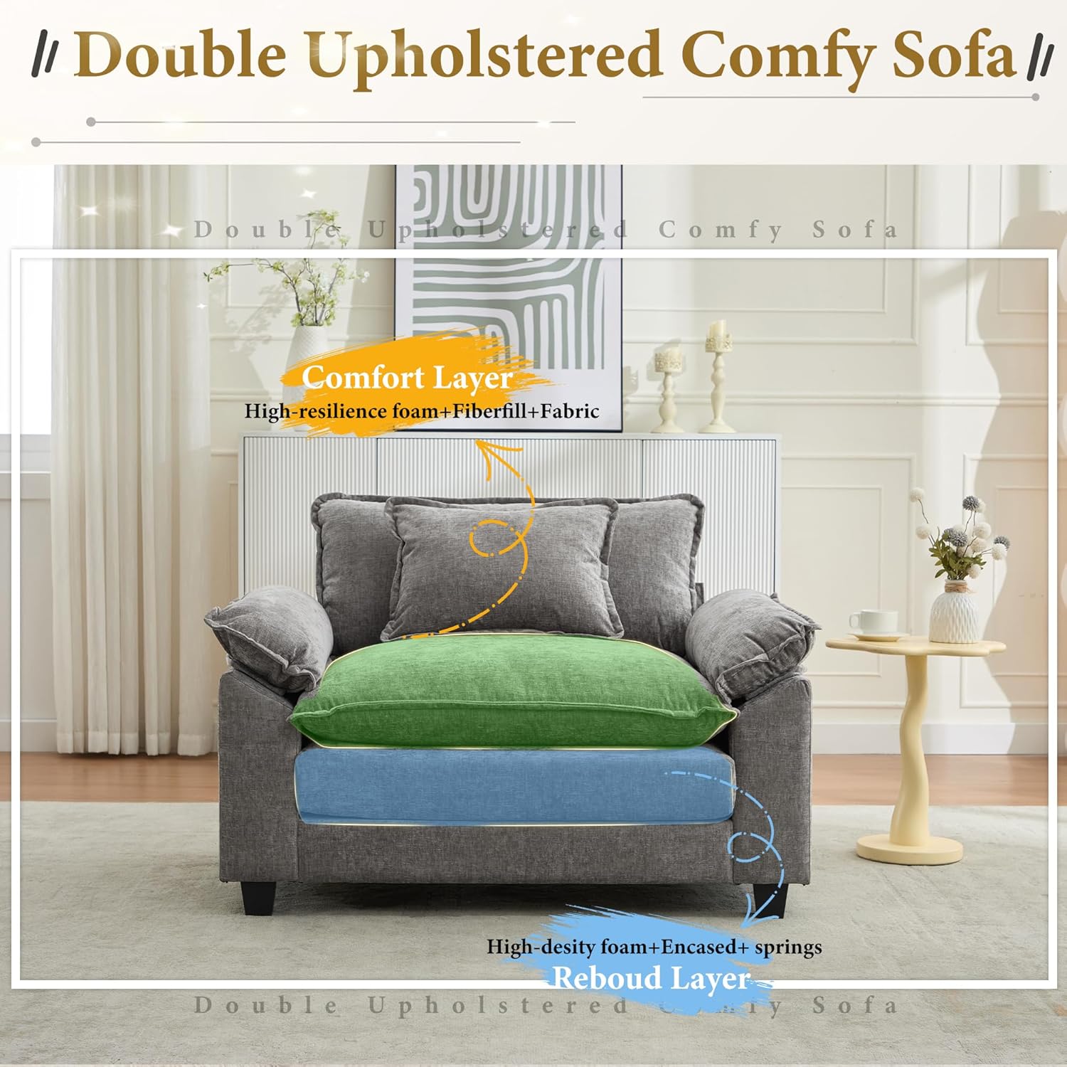 - Double Upholstered Sofa:The living room creative sofa is double thickly upholstered with high-density sponge padding and spring system, bringing luxurious comfort and support, greatly avoiding collapsing during long-term use.
