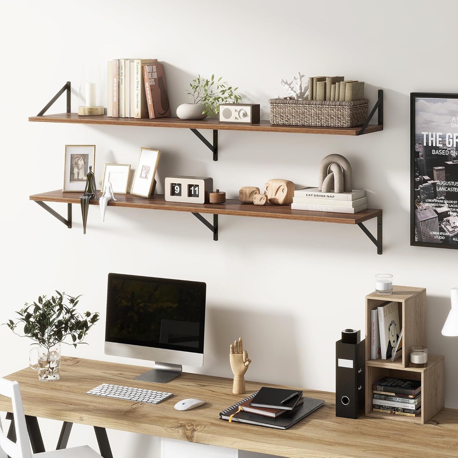 - ăDECORATIVE & FUNCTIONALăThe wall-mounted floating shelves are designed for decoration and storage, utilizing and decorating any space in your home. Used as shelf decor to show your collection, books, or prize, the hanging shelves are perfect for displaying your photo frame, small plants, model, or audio in your living room, office, study. And can also use as over the toilet storage shelf in the bathroom to hold toiletries or used as kitchen shelf to storage condiments.