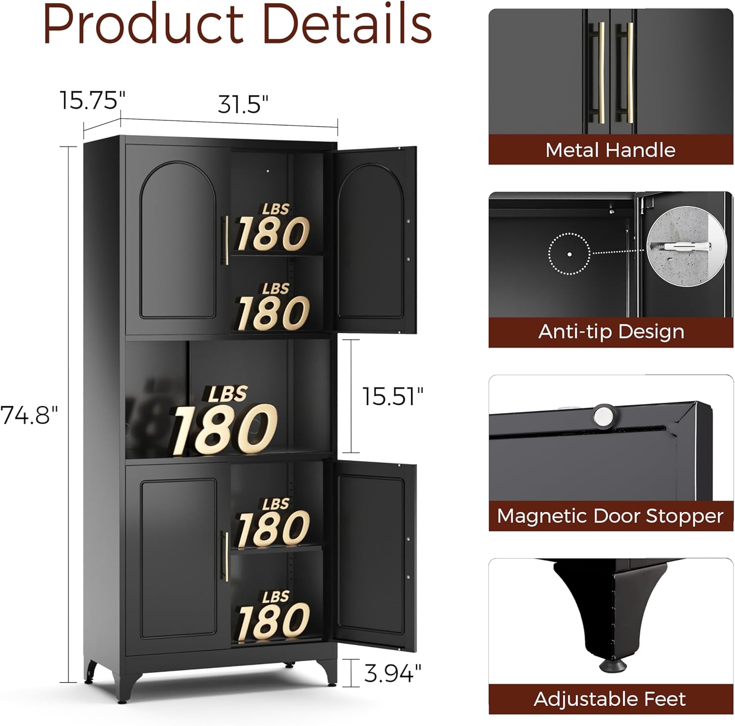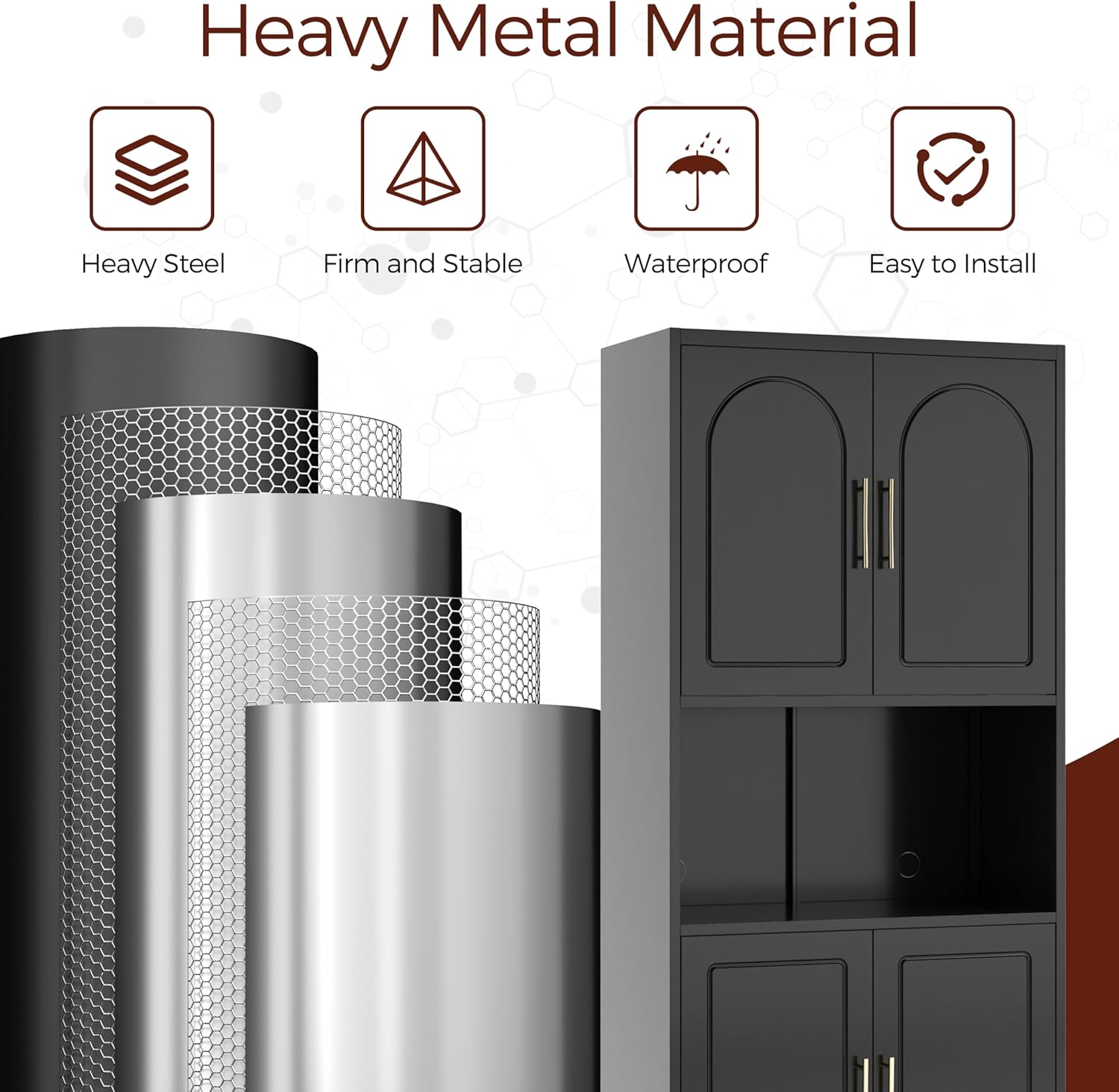 75" Tall Kitchen Pantry Storage Cabinet, Metal Storage Cabinets with 4 Doors and Adjustable Shelves, Black Kitchen Hutch Cabinet with Microwave Stand, Large Cupboard for Dining Living Room