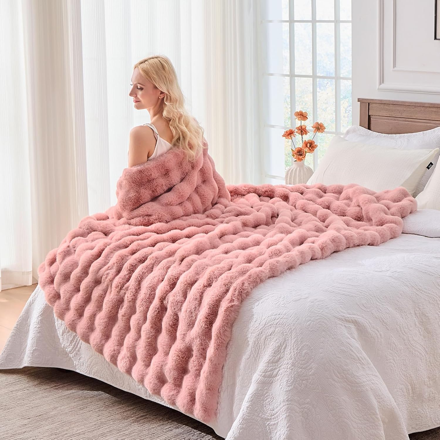 BENVWE Faux Fur Throw Blanket for Couch Bed - Fluffy Soft Thick Bubble Blanket for Living Room Home Decor - Mothers Day Birthday Gifts for Women, Dusty Pink, 63" x 80"