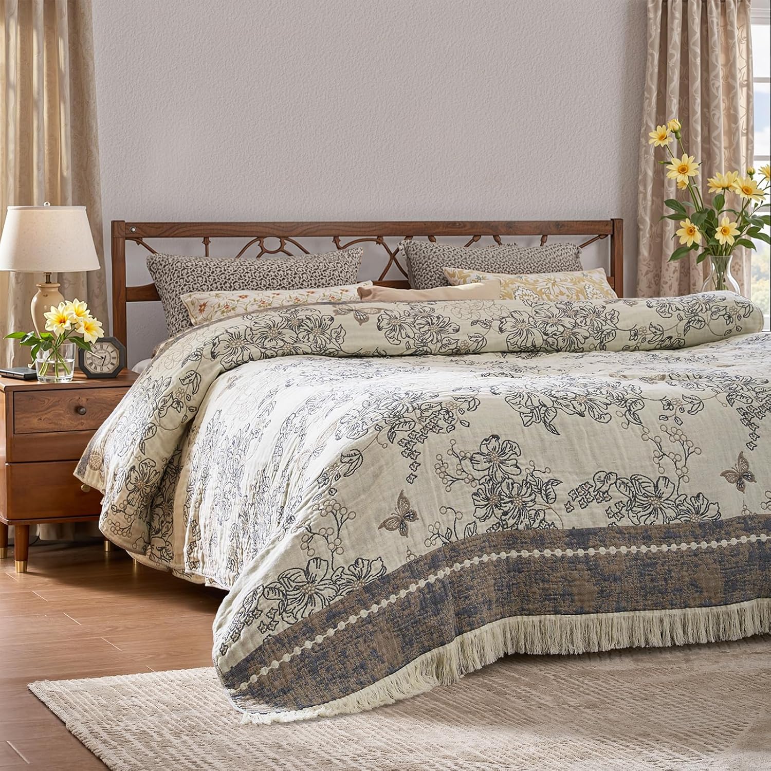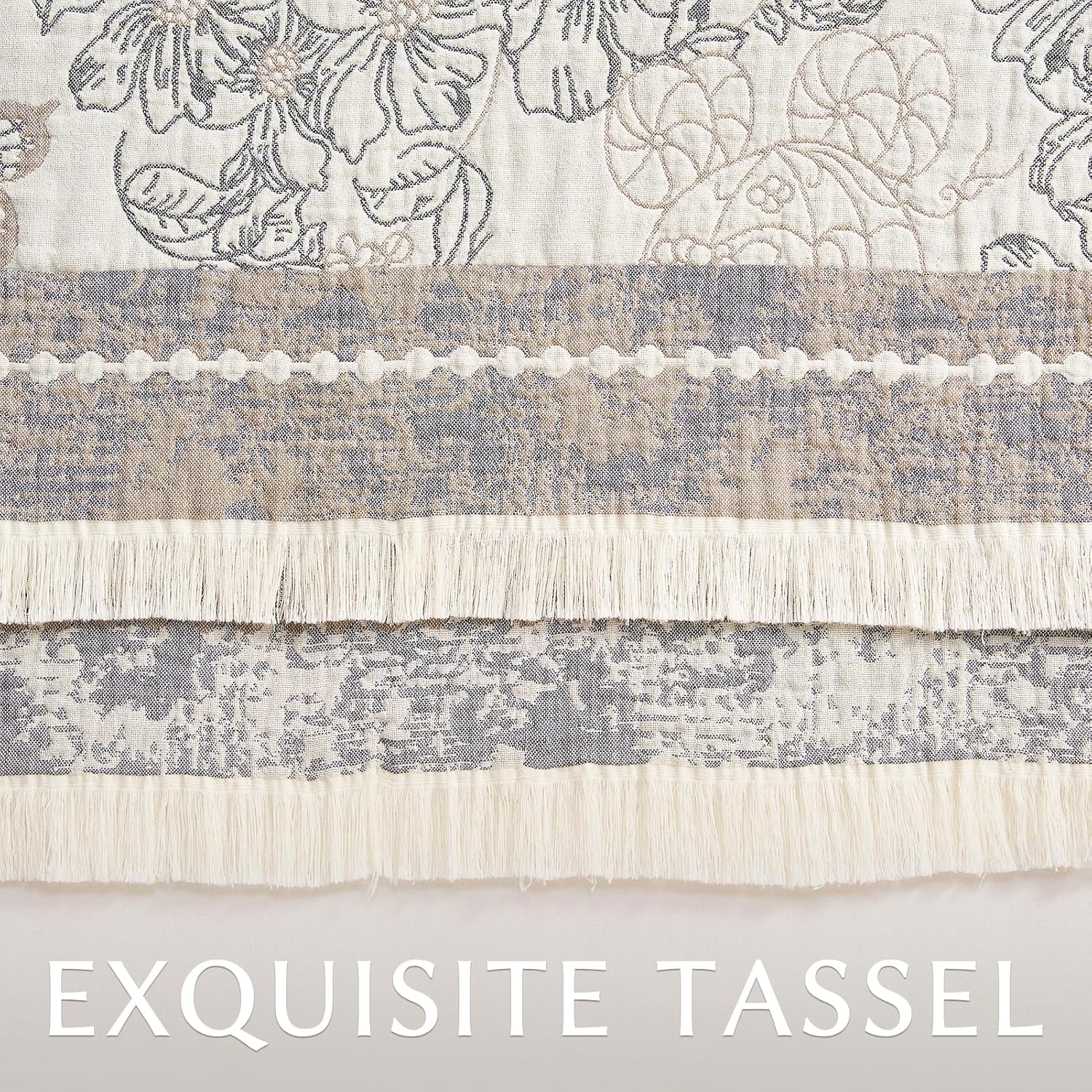 jinchan Boho Floral 100% Cotton Blanket 4-Layer Throw Blanket with Tassel Grey and White Flower Butterfly Soft Luxury Rustic Farmhouse Decor Blanket for Couch Bed 60x80 inch All Season Gift for Women