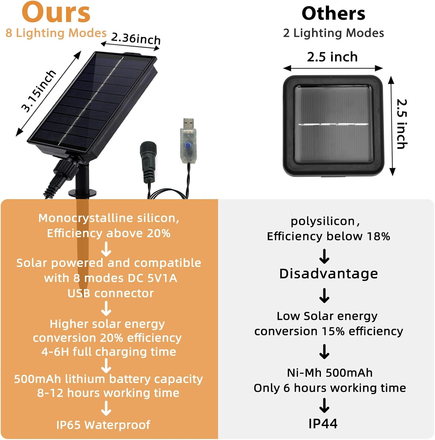 - 【Solar Panel and Compatible with USB Power Supply 】Solar string lights for outside are equipped with precision 180 degree adjustable monocrystalline silicon solar panels, built-in 500mAh lithium lon battery,lights up for all night (8-12 hours) after fully charged. Compatible with USB power supply for safe and energy efficient lighting for indoor use.