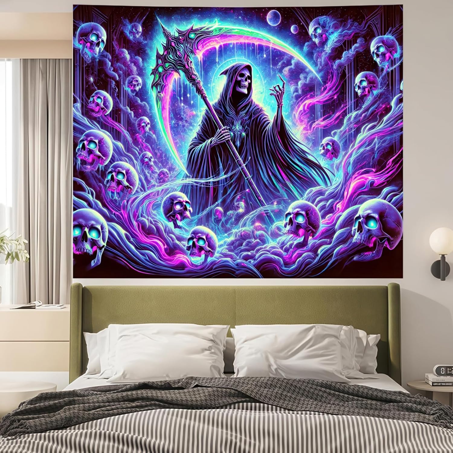 BlissYard Blacklight Skull Tapestry UV Reactive Tapestry 78x59 Inch Grim Reaper Gothic Skeleton Wall Tapestry Glowing Tapestry Large Neon Tapestry Wall Hanging for Living Room Bedroom Decor Teens