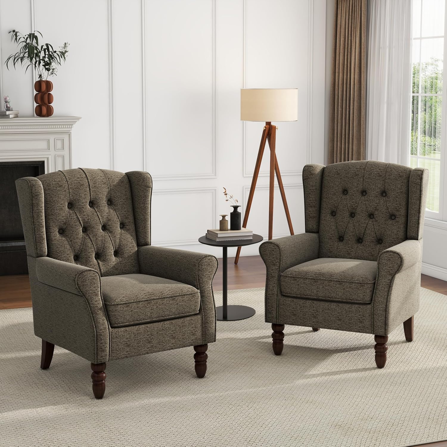 UIXE High Back Accent Chairs Set of 2, Upholstered Armchair in Fabric, Retro Wingback Arm Chair for Living Room, Comfy Single Sofa Bedroom Reading Seat with Solid Wood Legs - Taupe