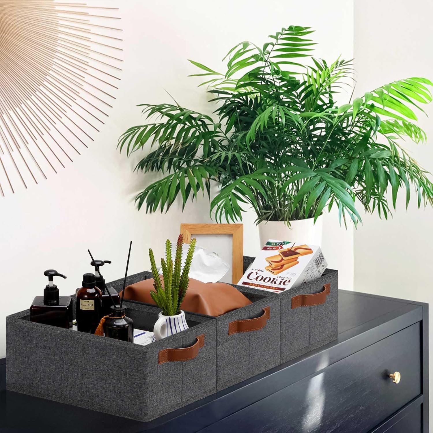 - 👍【QUALITY MATERIAL】Storage baskets for shelves are made of high-quality cationic fabric and polyester cotton fabric, and the inner layer is made of non-woven fabric, which is odorless, long-lasting and strong. Classic faux leather handles that adds a comfortable touch and provides a strong and comfort grip to pull and move. Fabric storage bin is easy to clean, just wipe with a damp sponge or cloth.