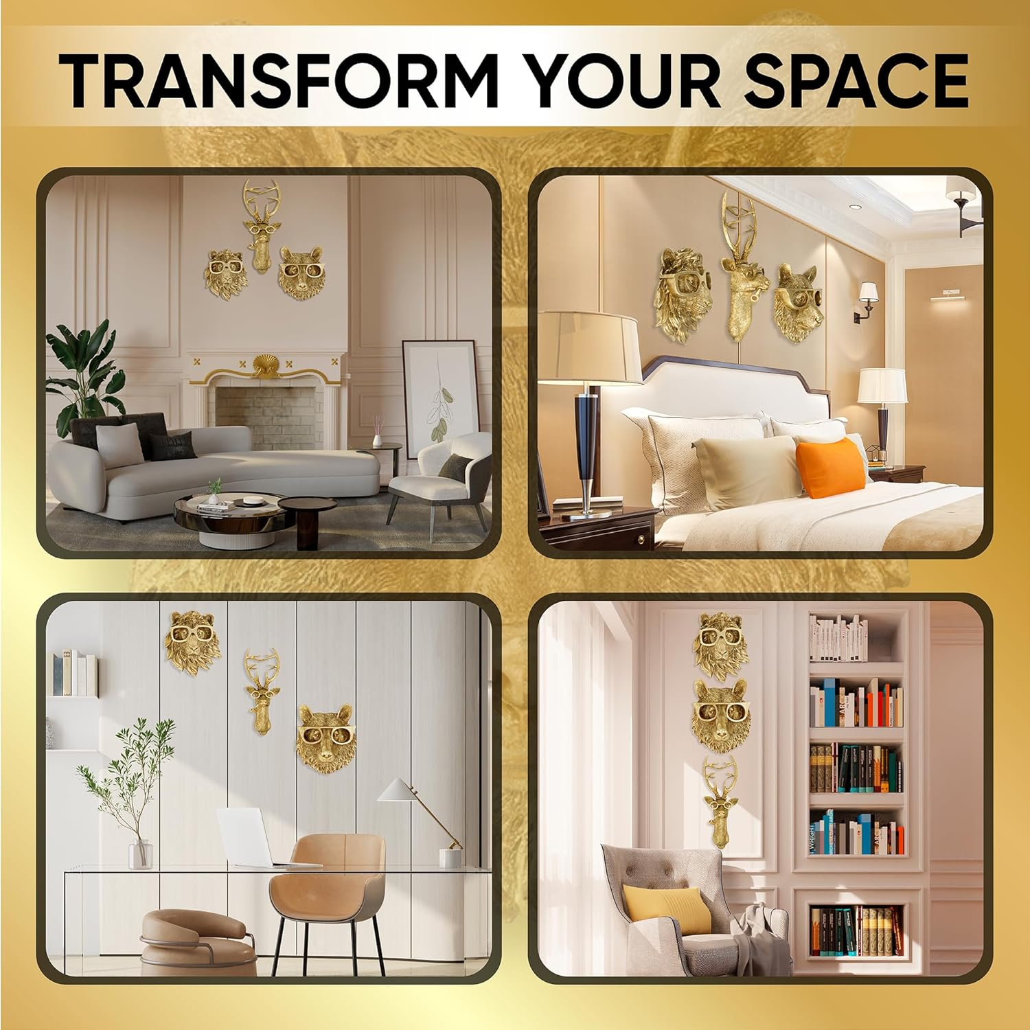 - Elegant Home Decor Addition: Transform any room with our set of three Victorian-style gold animal head sculptures—a deer, a lion, and a bear, each uniquely adorned with spectacles. Enhance your space with a blend of whimsy and sophistication.