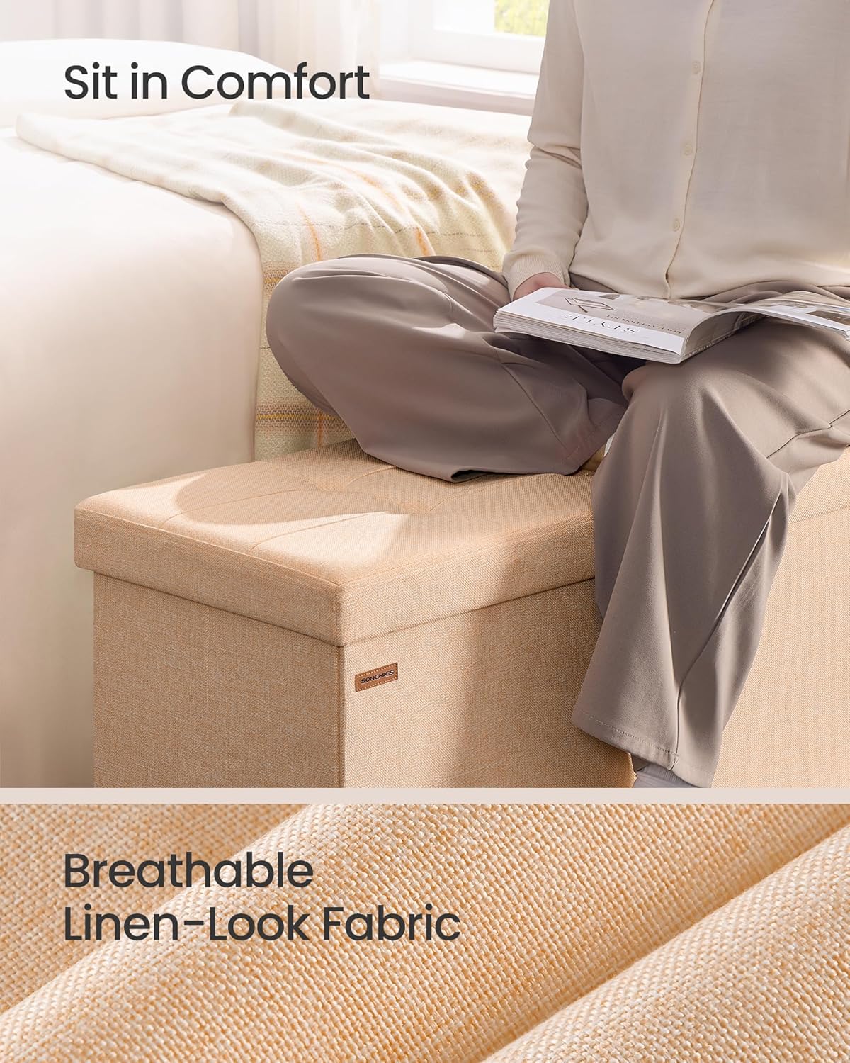 SONGMICS Mazie Collection - Storage Ottoman Bench, 43 Inches Folding Foot Rest Stool, End of Bed Bench, Easy Assembly, for Living Room, Bedroom, Entryway, Apricot Orange ULSF077O01