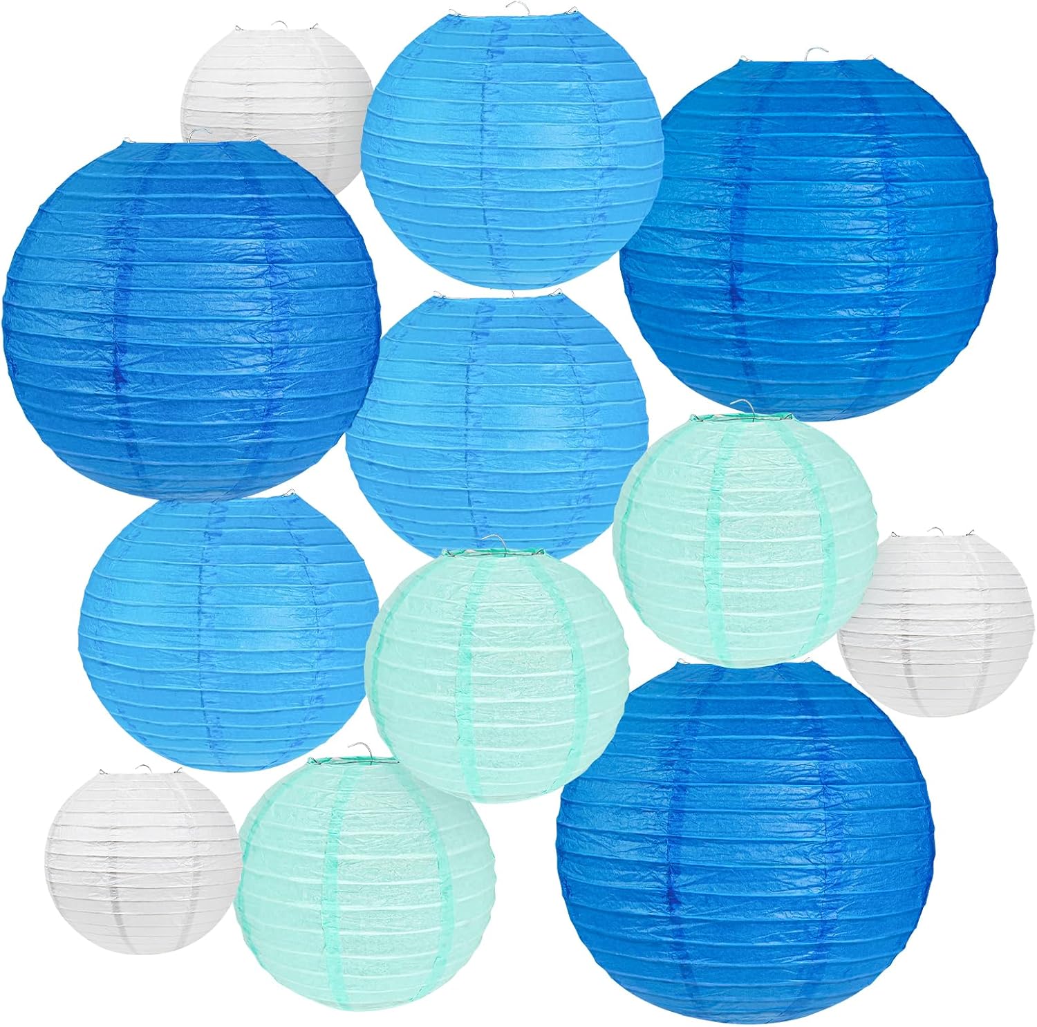 12Pcs Blue and White Paper Lanterns Assorted Sizes (6" 8" 10" 12") for Home Decor, Wedding, Birthday, Underwater Themed Party Decorations, Hanging Chinese Japanese Paper Lantern (3 Blue Colors)