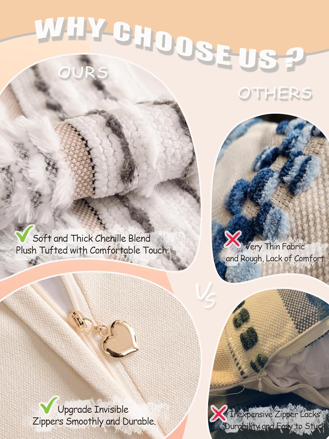 - INVISIBLE ZIPPER CLOSURE: Designed with a smooth heart invisible zipper, these cushion covers provide a seamless look while ensuring easy insertion and removal of pillow inserts. our high-quality zippers enhance durability and smoothness compared to ordinary zippers, ensuring struggle with a faulty zipper.