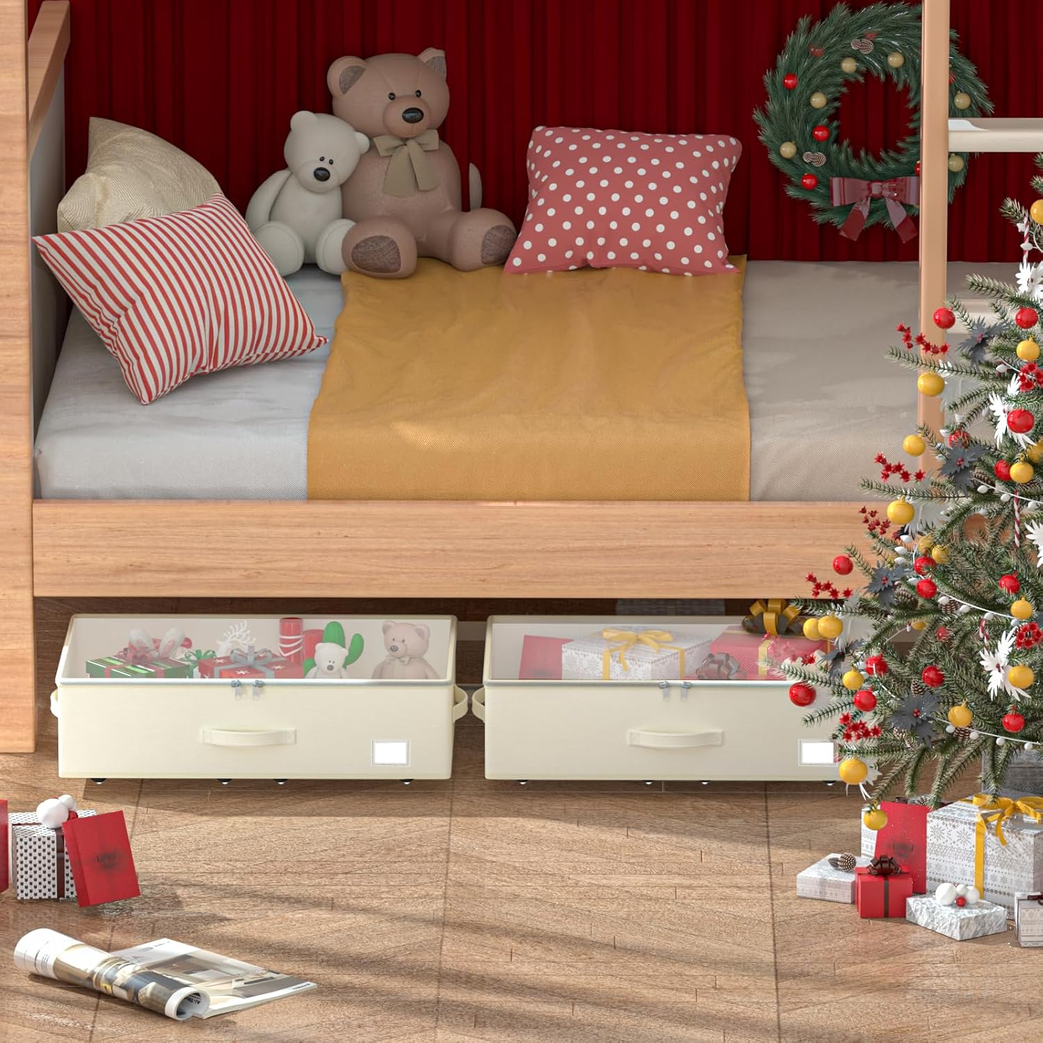 - [Multifunctional Storage Solution]: Our underbed storage box offers versatility for various storage needs. Secured with Velcro, the bottom frame and storage box can be utilized in different places, including closets, cloakrooms, bedrooms, baby rooms, under cribs, and dorms. It's perfect for storing seasonal clothes and everyday items. When not in use, simply fold them up to save space.
