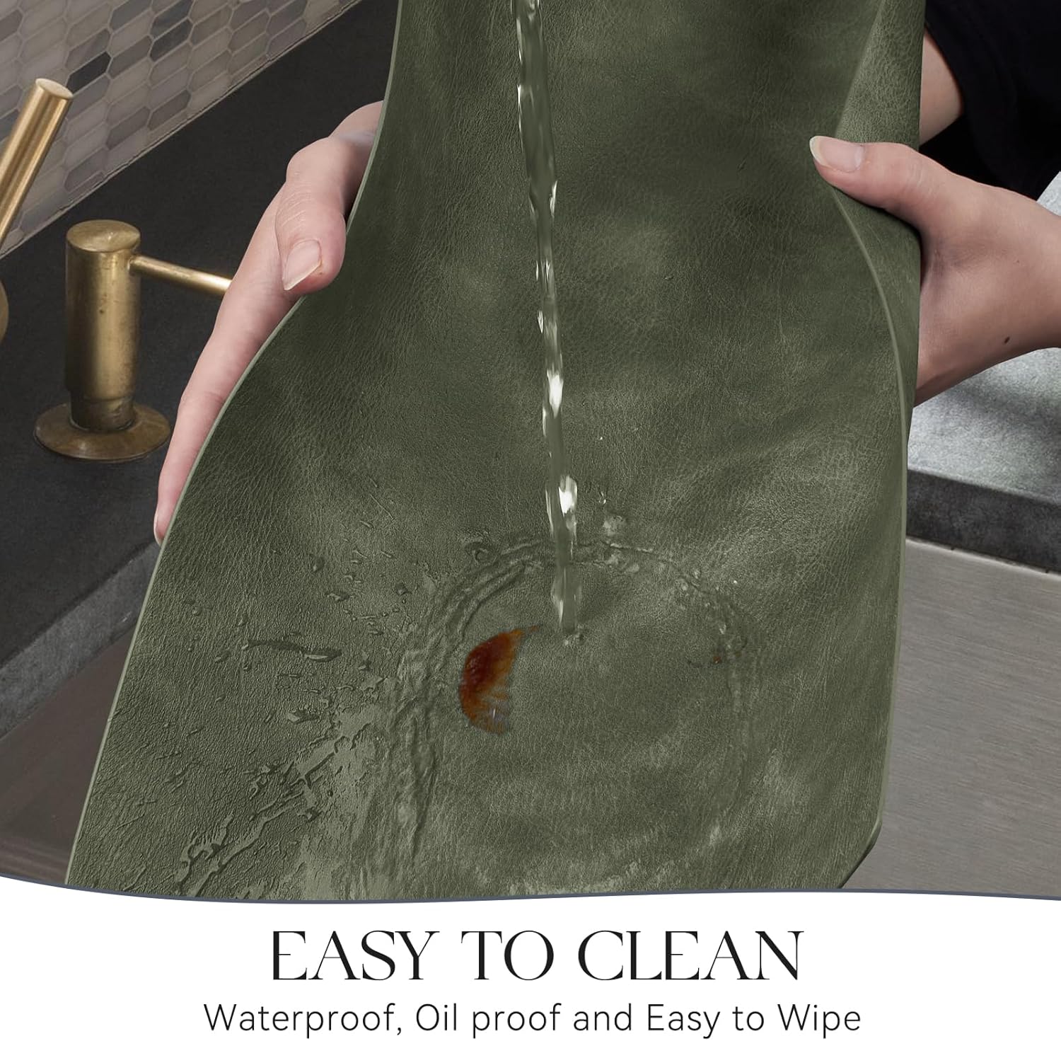 - HASSLE-FREE CLEANING: Our faux leather placemats are designed to be 100% waterproof to better protect the table from grease and grime compared to woven and fabric placemats. If the placemats get stained with sauce or food residue, simply wipe with a cloth or rinse with water.