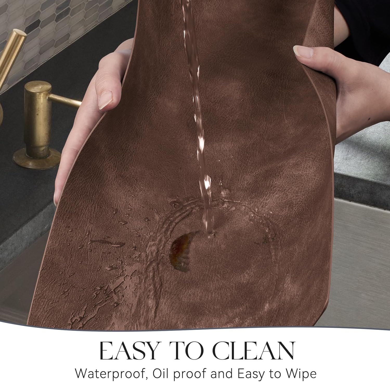 - HASSLE-FREE CLEANING: Our faux leather placemats are designed to be 100% waterproof to better protect the table from grease and grime compared to woven and fabric placemats. If the placemats get stained with sauce or food residue, simply wipe with a cloth or rinse with water.