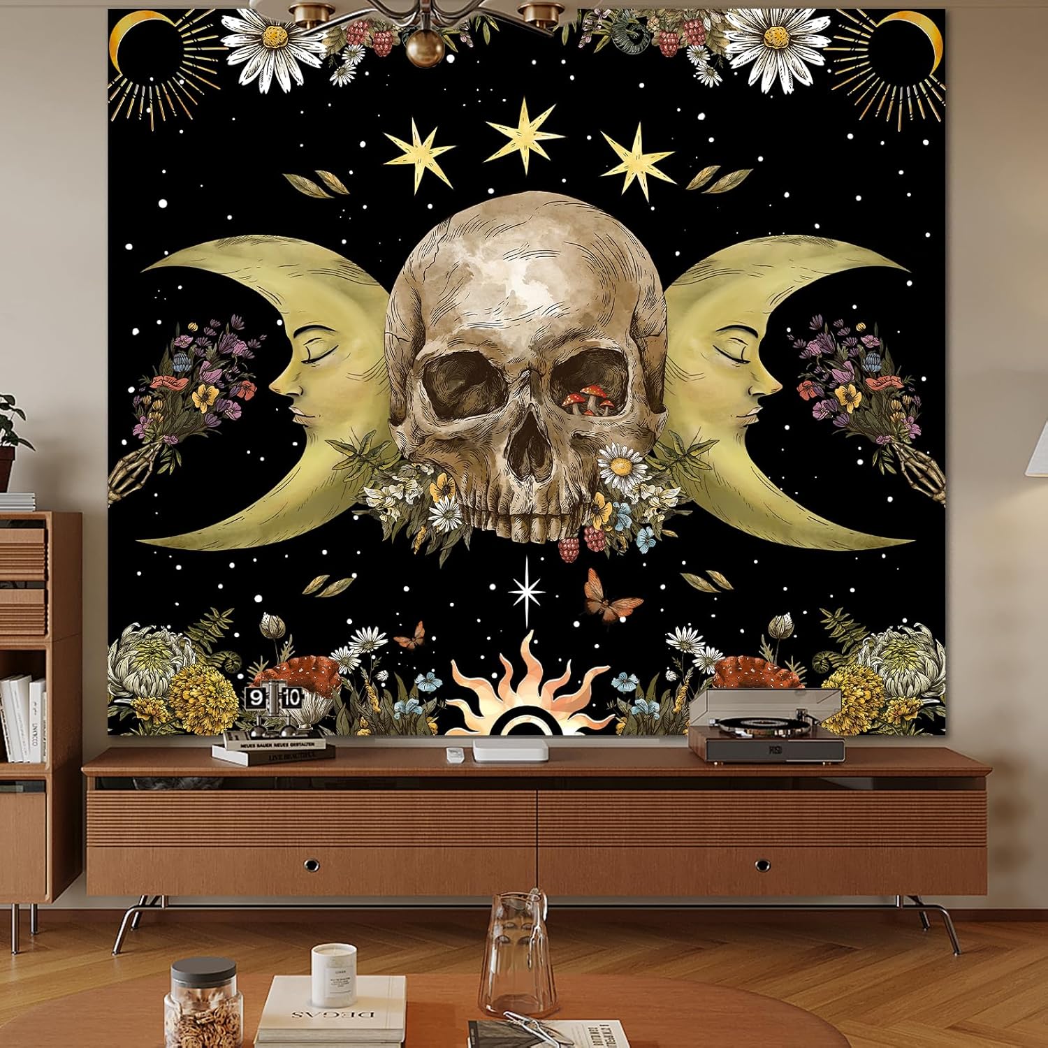 Atrippy Halloween Vintage Gothic Tapestry for Bedroom, Goth Skull Floral Wall Decor Tapestry, Sun and Moon Skeleton Flower Tapestries Aesthetic, Dark Room Decor Wall Hanging for Living Room Dorm 51x60 Inches